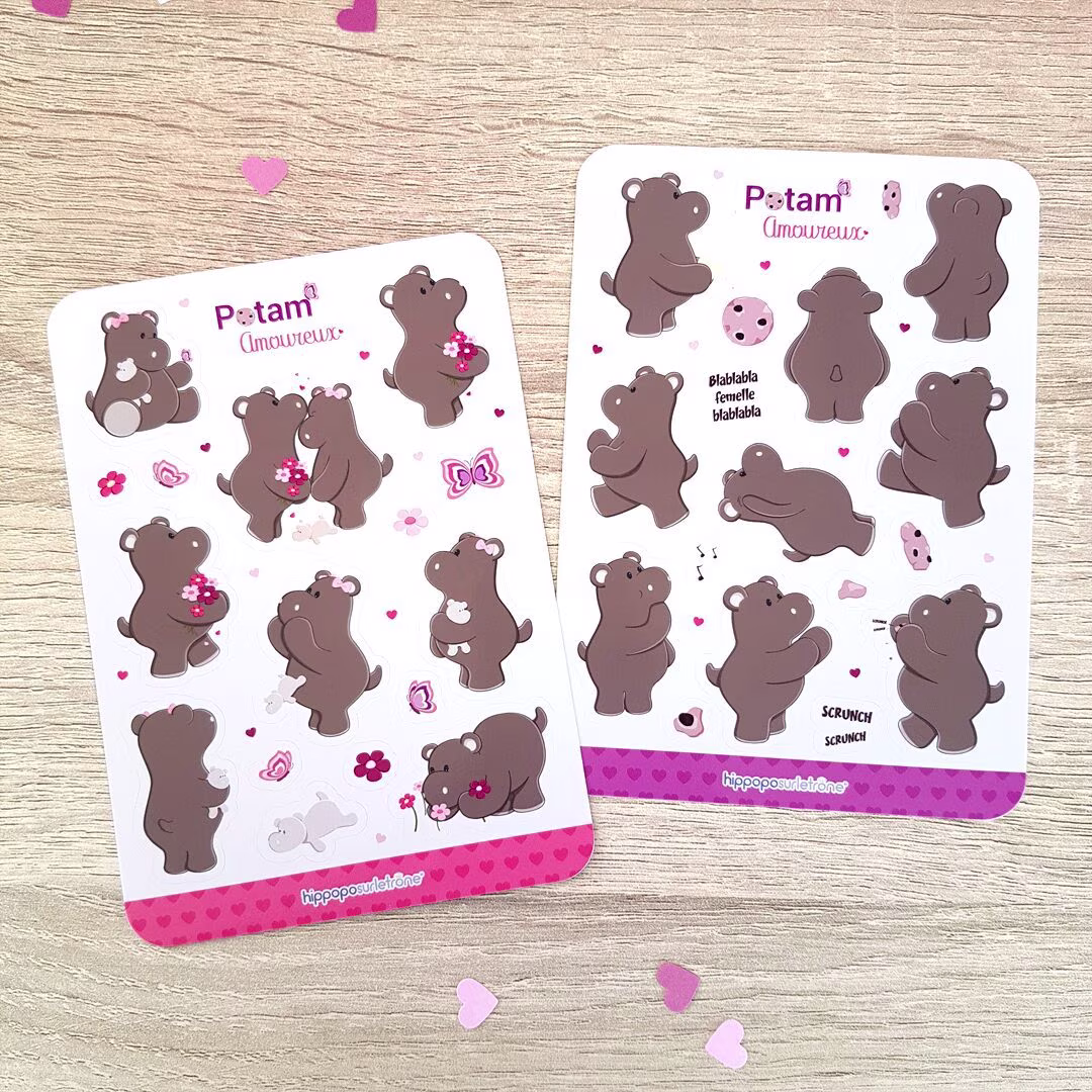 2 Planche de Stickers – Hippopotame – Potam Amoureux