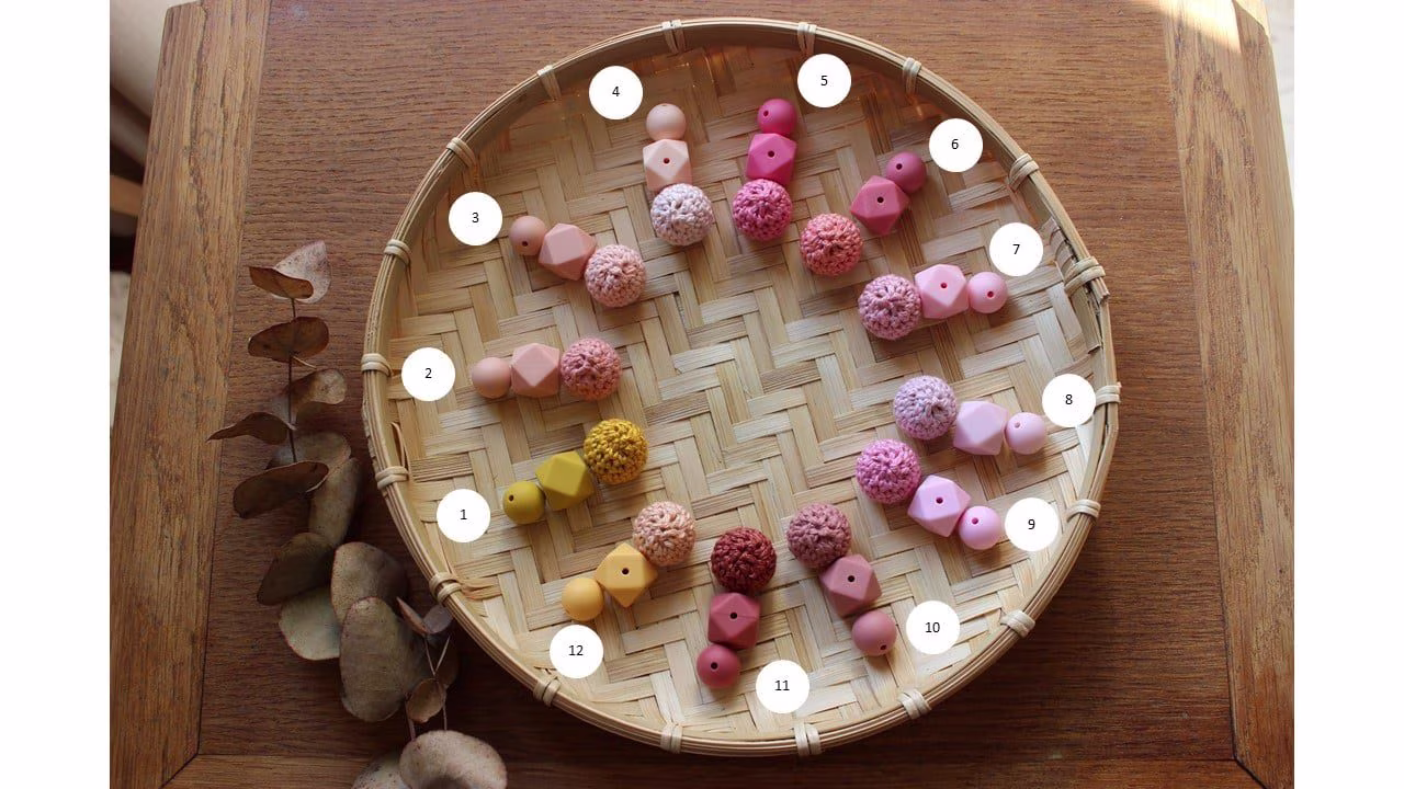 Il est possible de nettoyer les perles en bois et en silicone à l’aide d’un chiffon humide et de savon naturel.