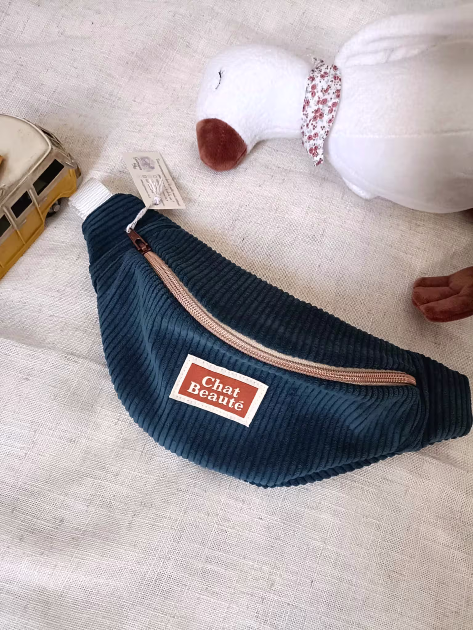 Tissu extérieur en velours côtelé et doublure en coton, le tout couronné d’une jolie étiquette.
