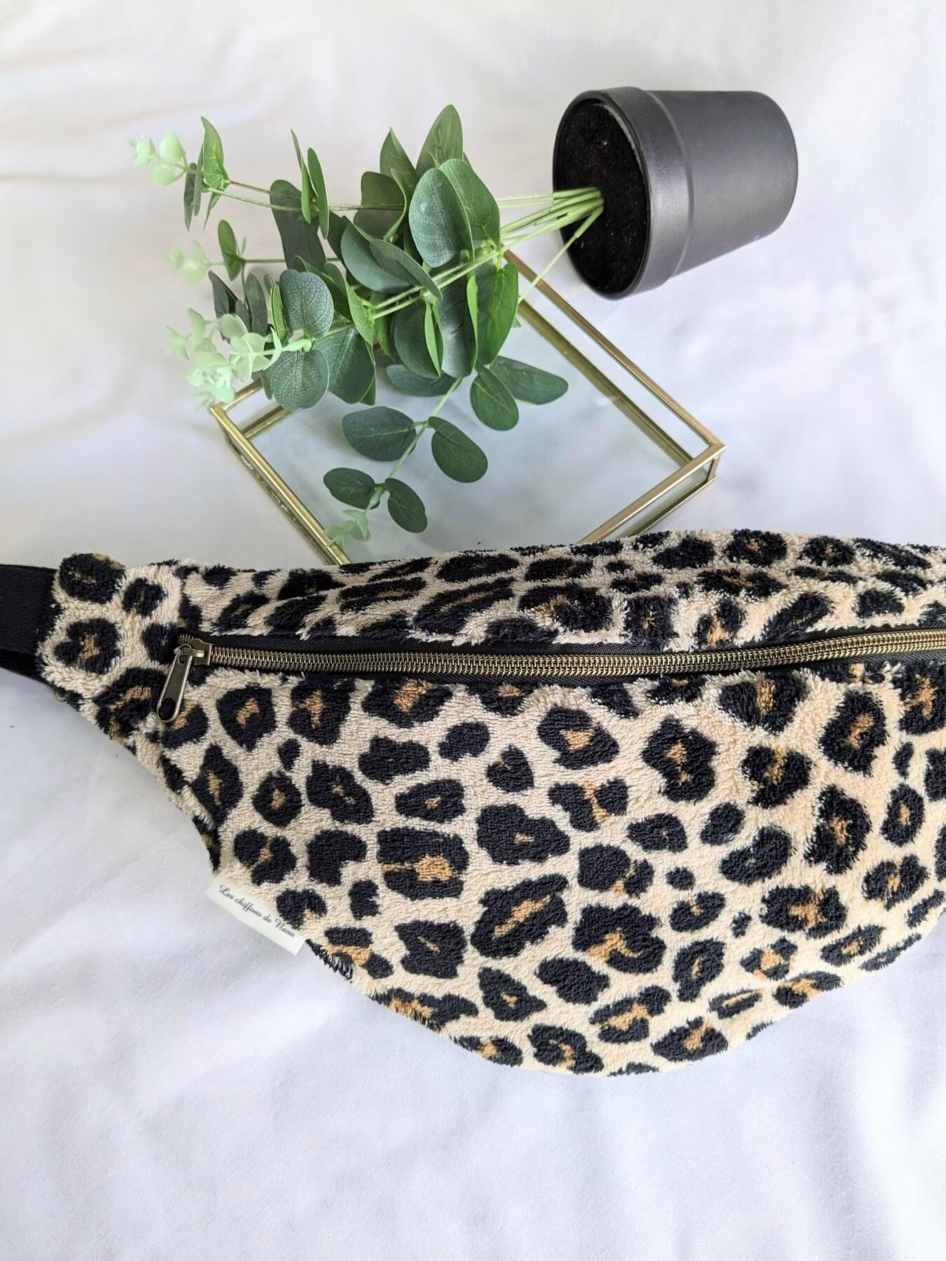 Sac banane en tissus fausse fourrure léopard , doublure intérieur en coton beige avec une double poche intérieure avec zip.