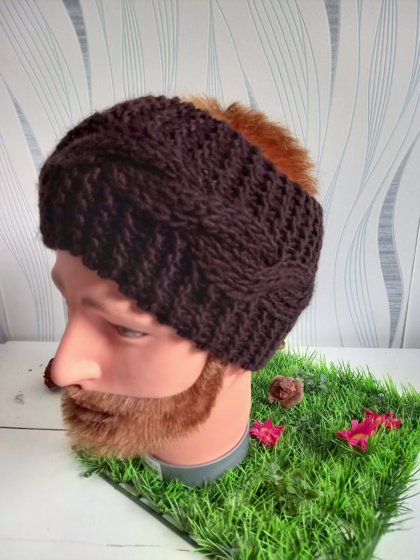 Très joli bandeau homme avec torsade tricoté main dans une laine marron