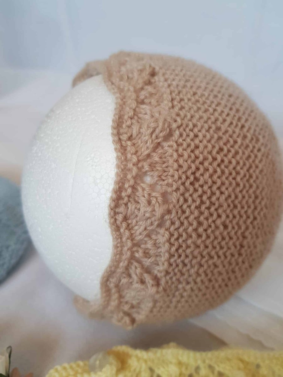 •  Béguin tricoté à la main au point mousse avec une laine Mérinos OEKO-TEX