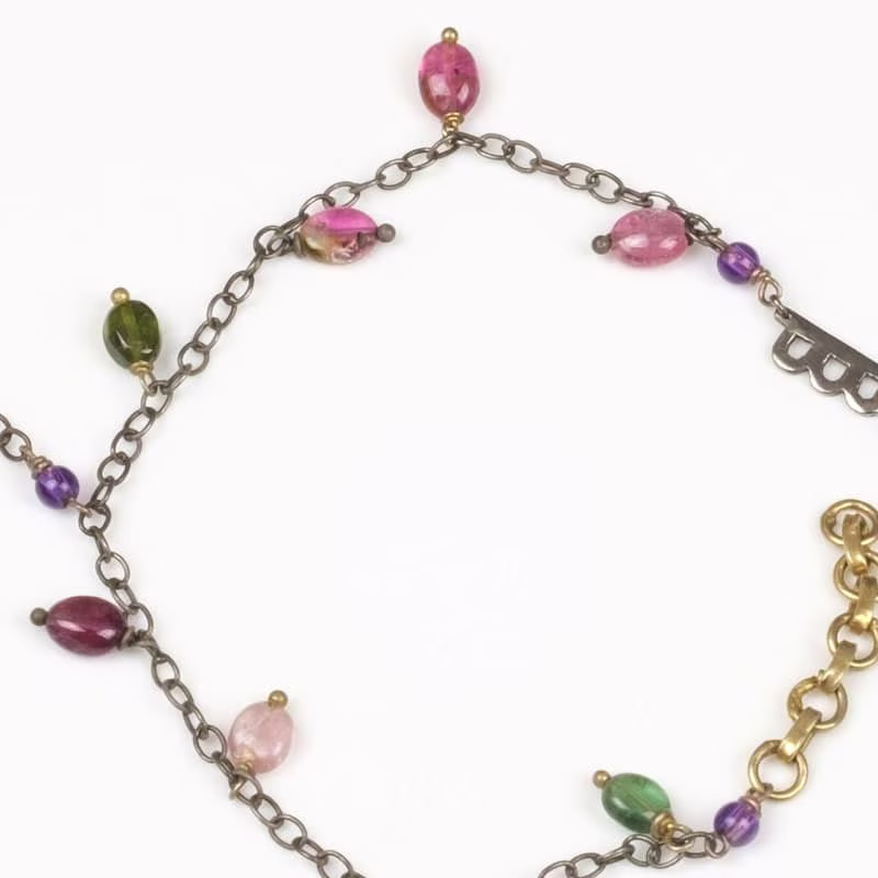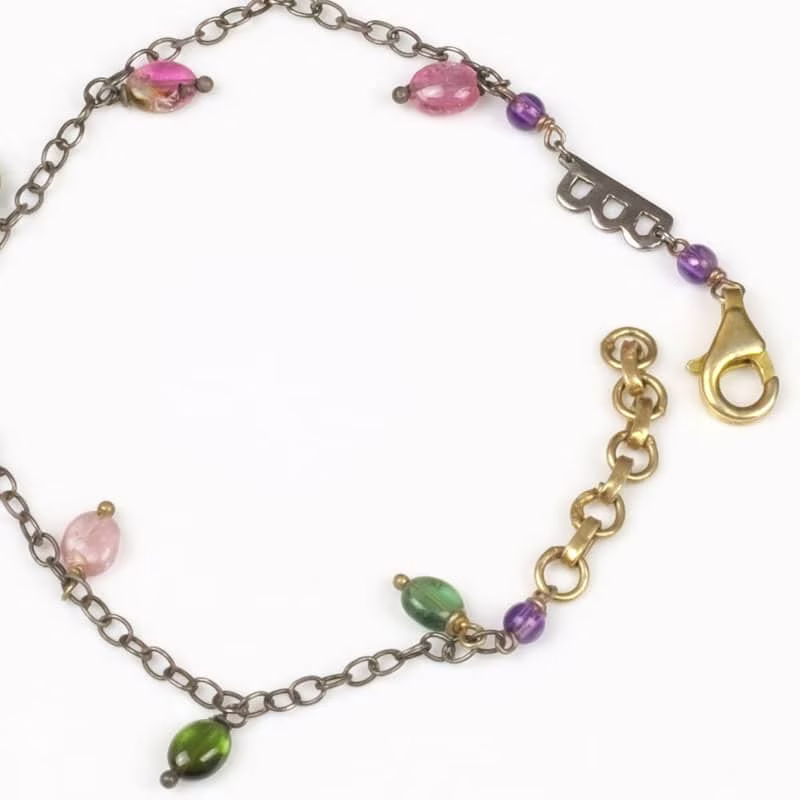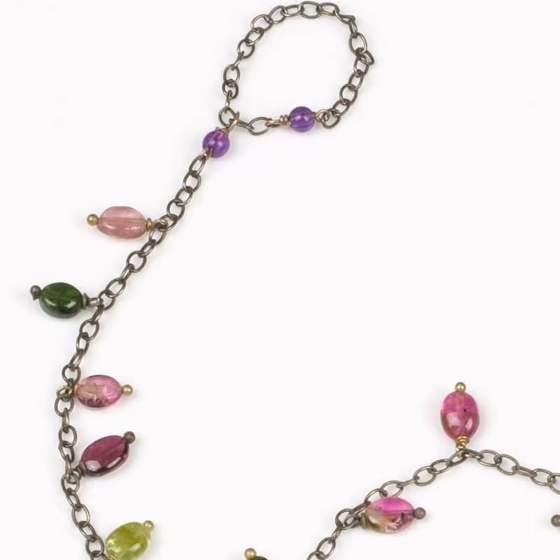 Bracelet Bague Création Bohême n°1, monté en Argent 925 plaqué Rhodium Noir, Fermoir en Argent 925 plaqué Or et Pierres semi-précieuses assemblées en queue de cochon. Ellest composées de 6 Améthystes à chaque extrémité et de 13 Tourmalines de différentes couleurs qui donnent du mouvement.
