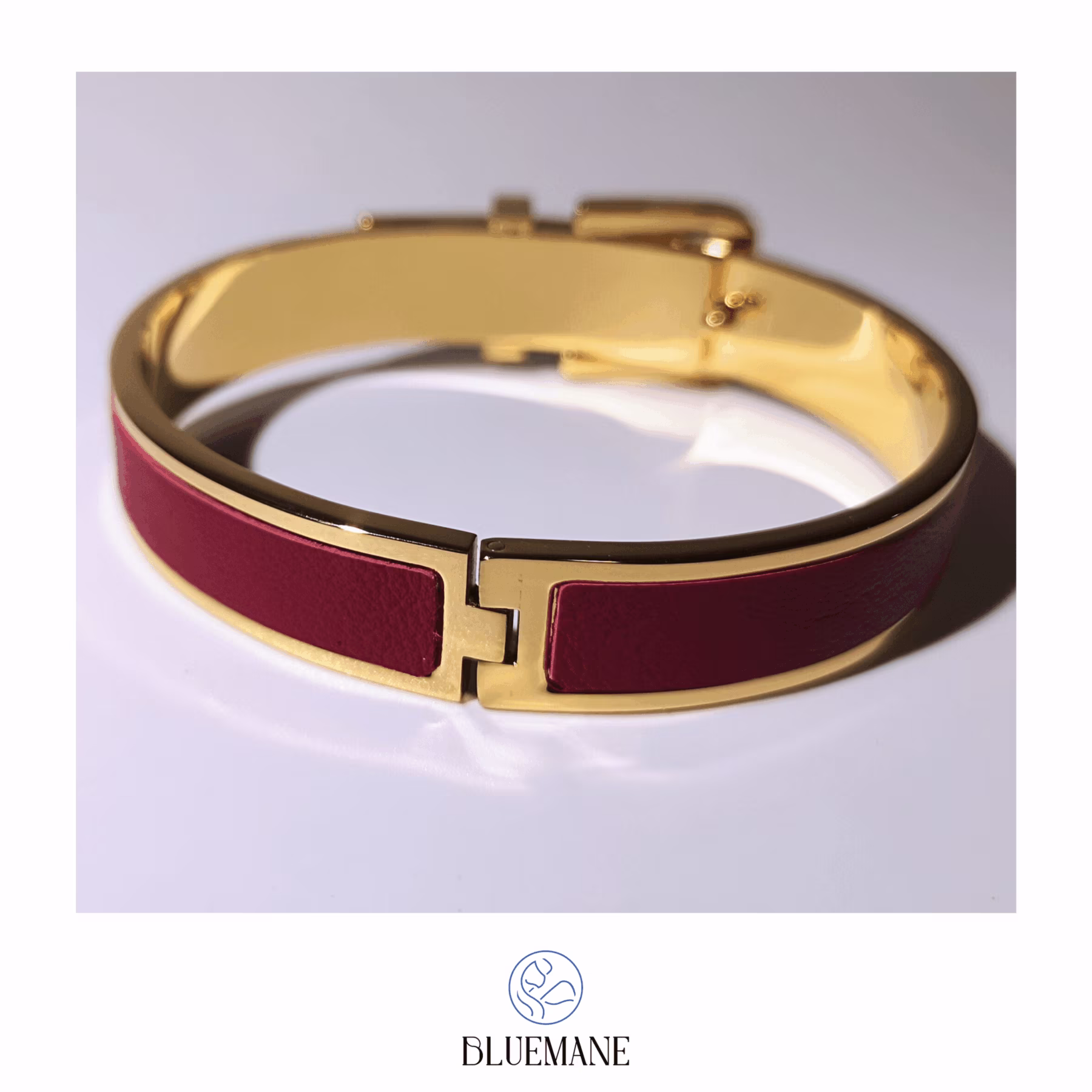 Bracelet “ceinture” d’exception avec des matières nobles : Inox plaqué or 24K, réhaussé d’un superbe cuir coloris rouge.