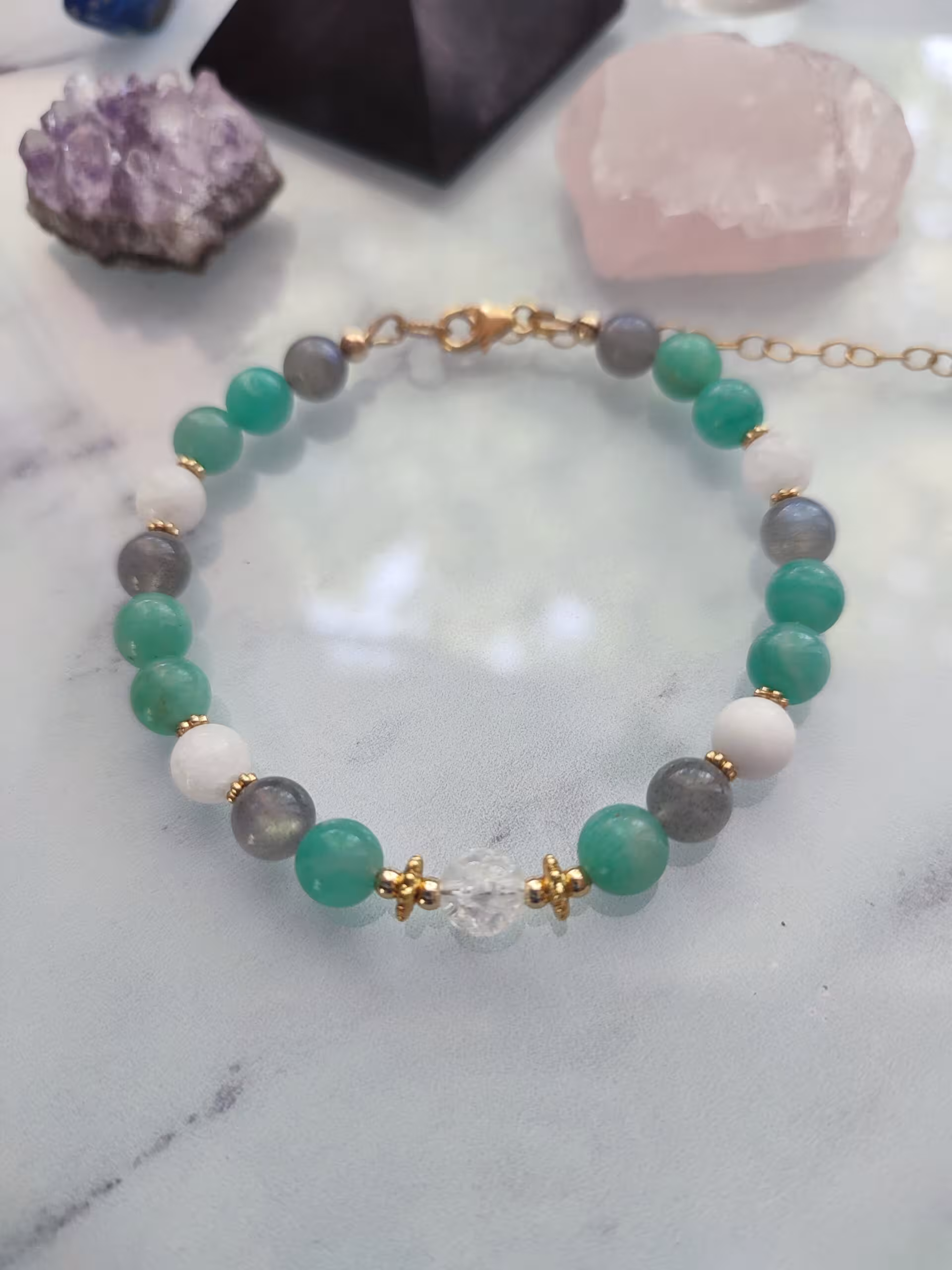 Ce bracelet raffiné est composé de perles naturelles de 6 mm d’ Amazonite (vert doux), de Labradorite (gris translucide à reflets bleutés), de Jade blanche et de Cristal de roche craquelé.