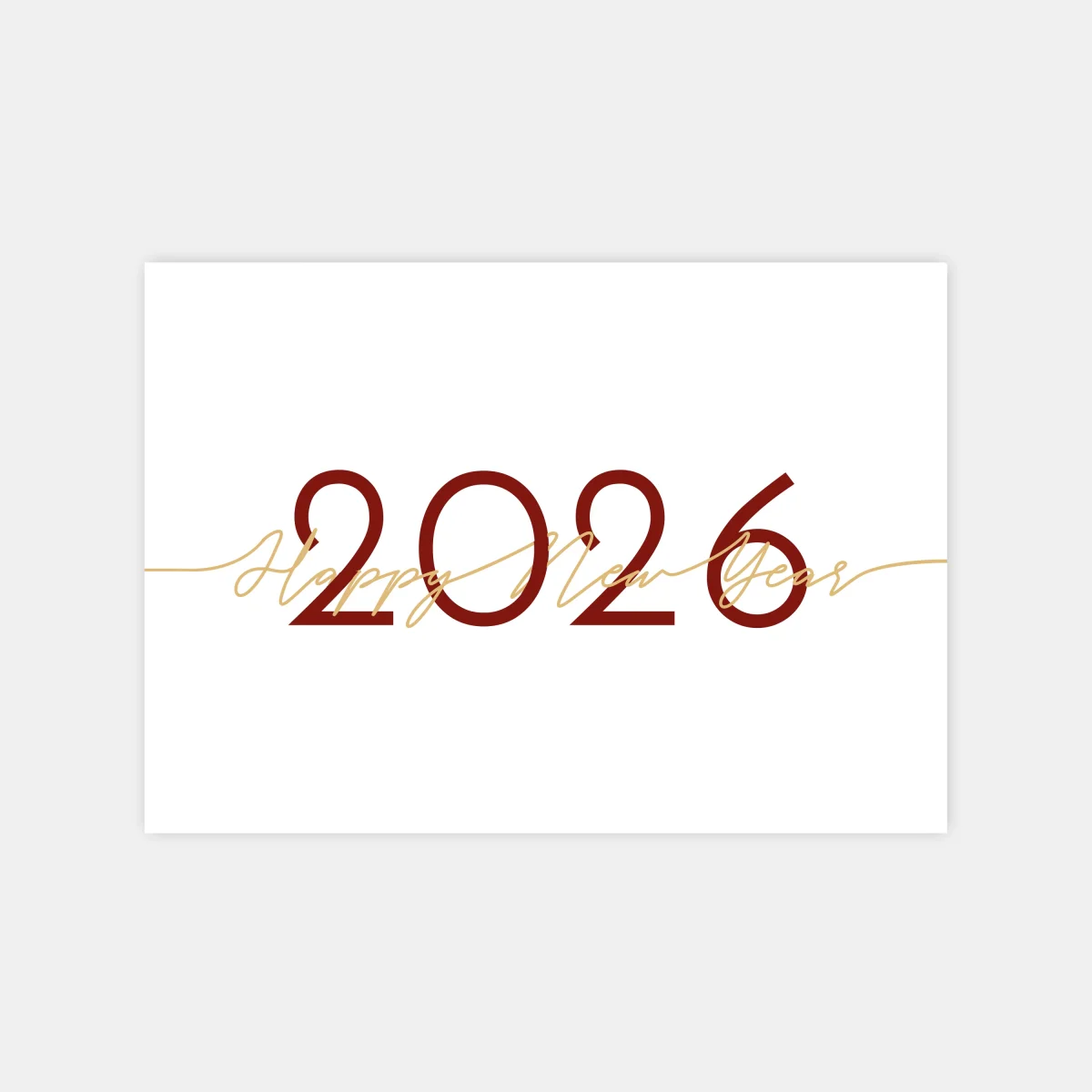 Notre carte de voeux Happy new year calligraphie est un joli mélange d’un beau logo type épuré représentant l’année 2026 dessiné à la main personnalisable et d’une mise en page élégante composée d’une jolies typographies modernes.
