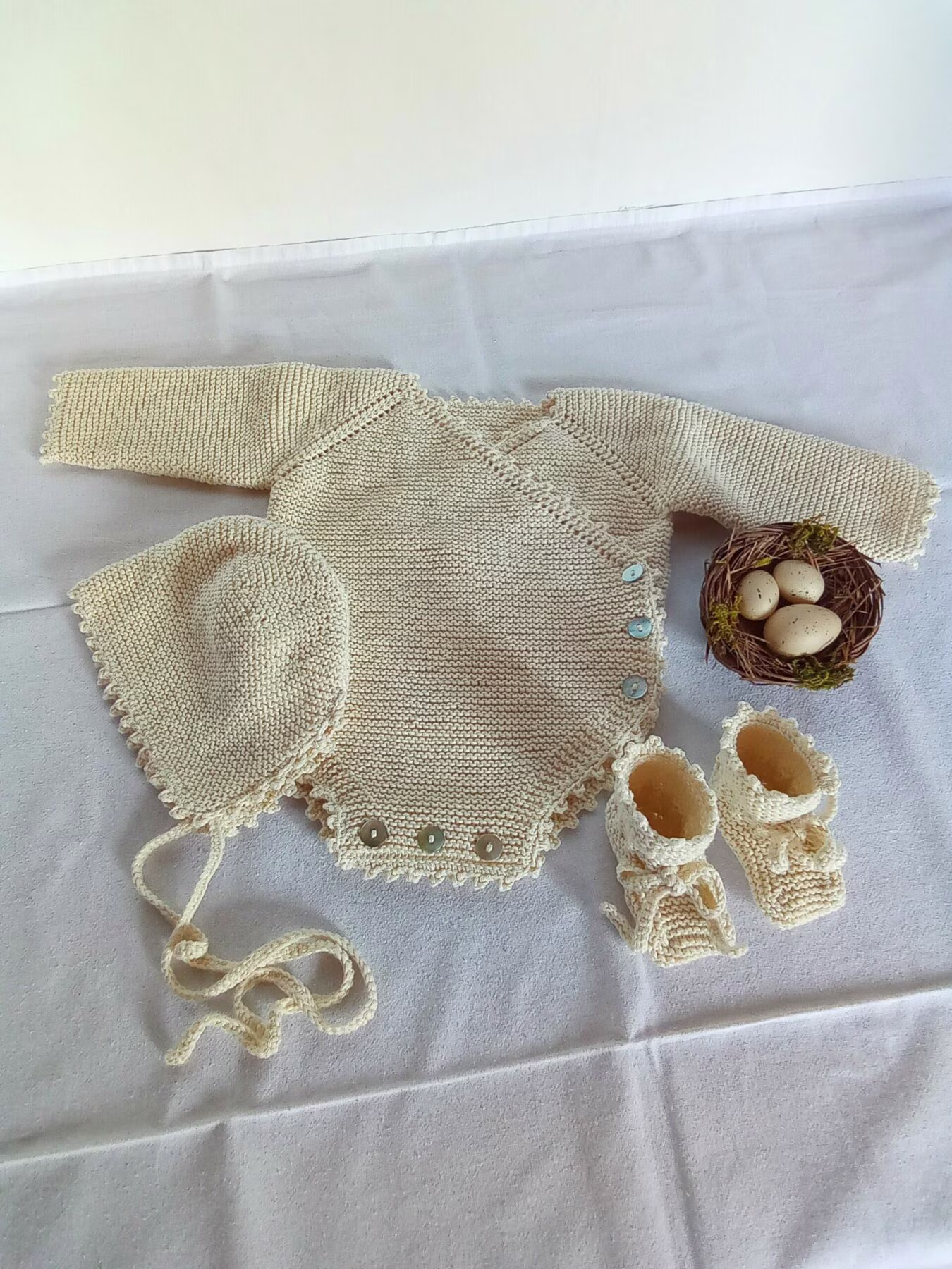 - Ce coffret Naissance est tricoté à la main avec un fil de coton OEKO-TEXÂ