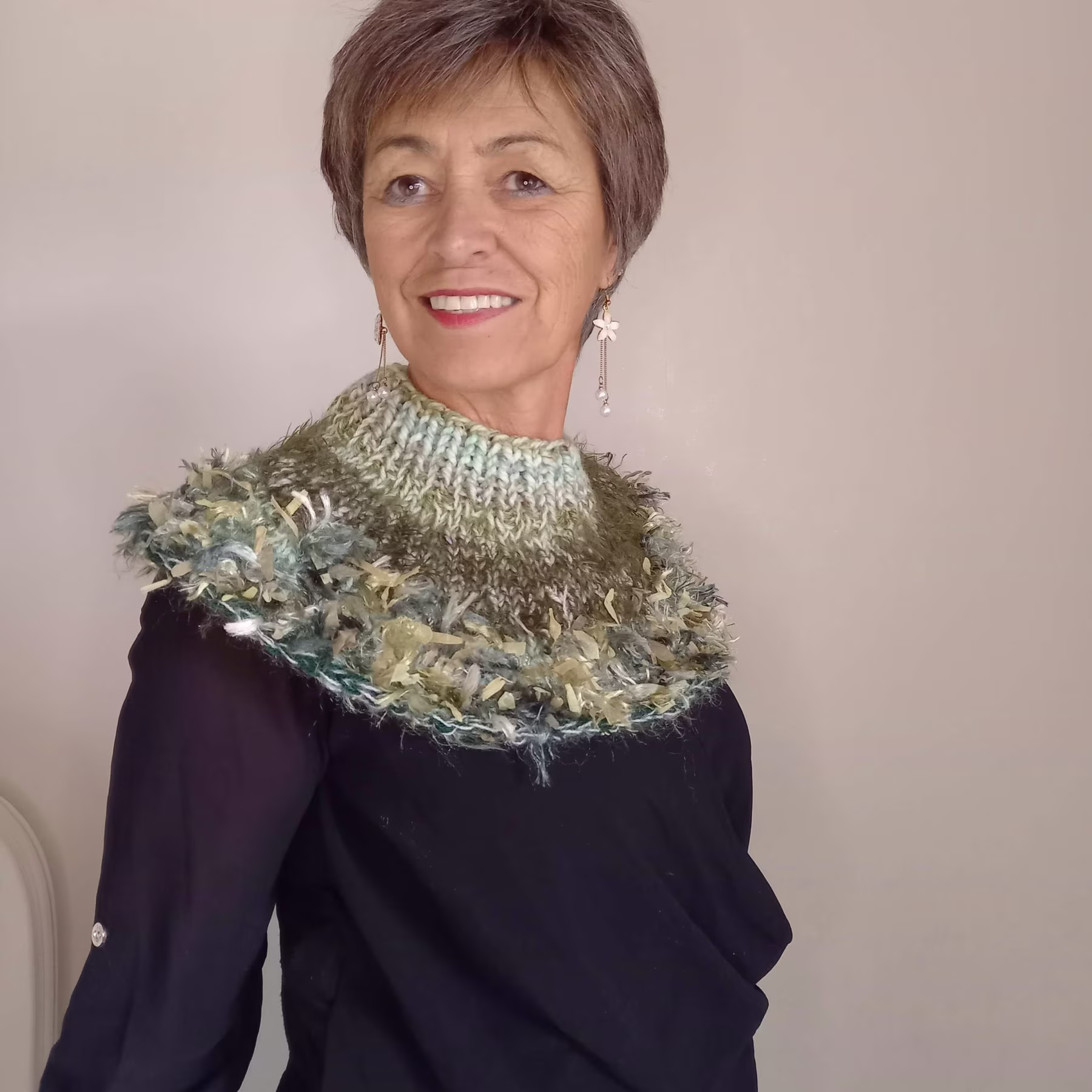 Chauffe épaule pour femme tricoté en laine dans des tons de vert.