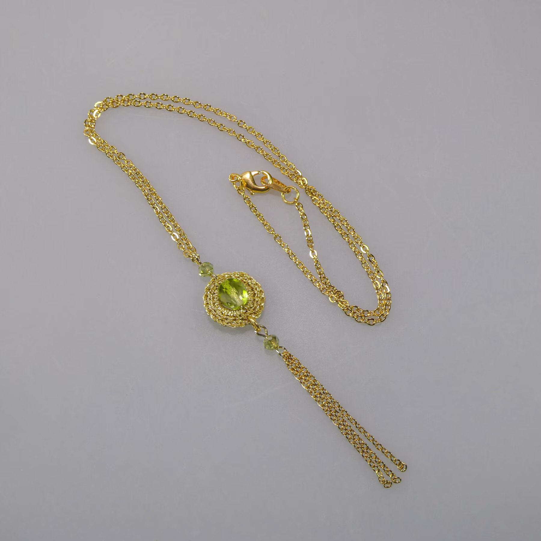 Ce collier délicat et sophistiqué est centré sur un médaillon aérien de 1 cm, créé par un fin travail de crochet du fil à bijoux autour d’un anneau. Au cÅ“ur de cette structure légère, une perle de verre est soigneusement insérée. Un pompon mobile, composé de trois chaînes fines, apporte du mouvement. De petites perles de verre assurent la liaison avec la chaîne principale et rehaussent le sommet du pompon. Le bijou se ferme à l’aide d’un fermoir mousqueton classique.