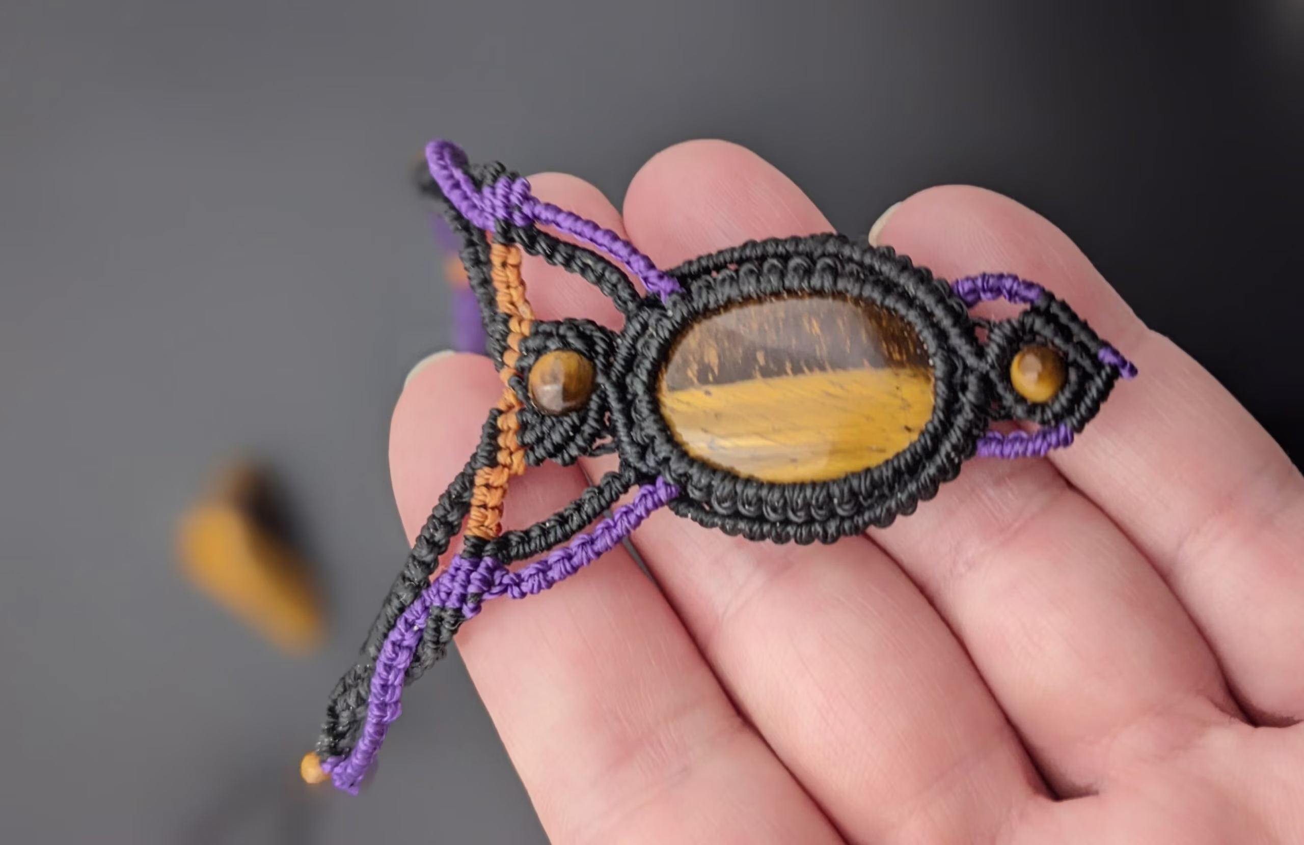 La pièce centrale est un superbe cabochon en œil de tigre de 29 mm x 21 mm, une pierre fine naturelle réputée pour ses propriétés protectrices et énergisantes. Il est magnifiquement mis en valeur par ces différentes couleur de fil linhasita .