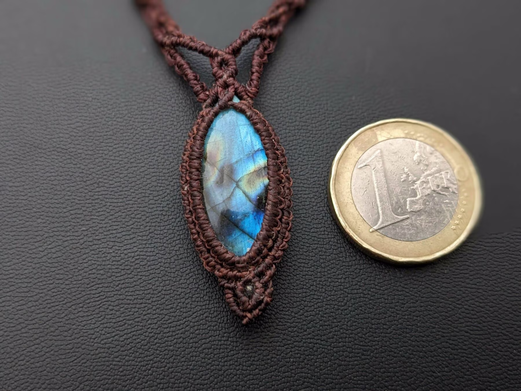 Ce bijou unique a été réalisé avec du fil linhasita marron agrémenté de touches de bleu, mettant en valeur une magnifique marquise en pierre fine labradorite bleue et trois perles de bohèmes aux reflets bleu métallique .