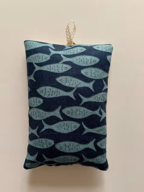 Coussin de porte ou d’armoire brodé sur le thème de la mer, rempli de lavandes séchées. Dentelle et bouton anciens.Â