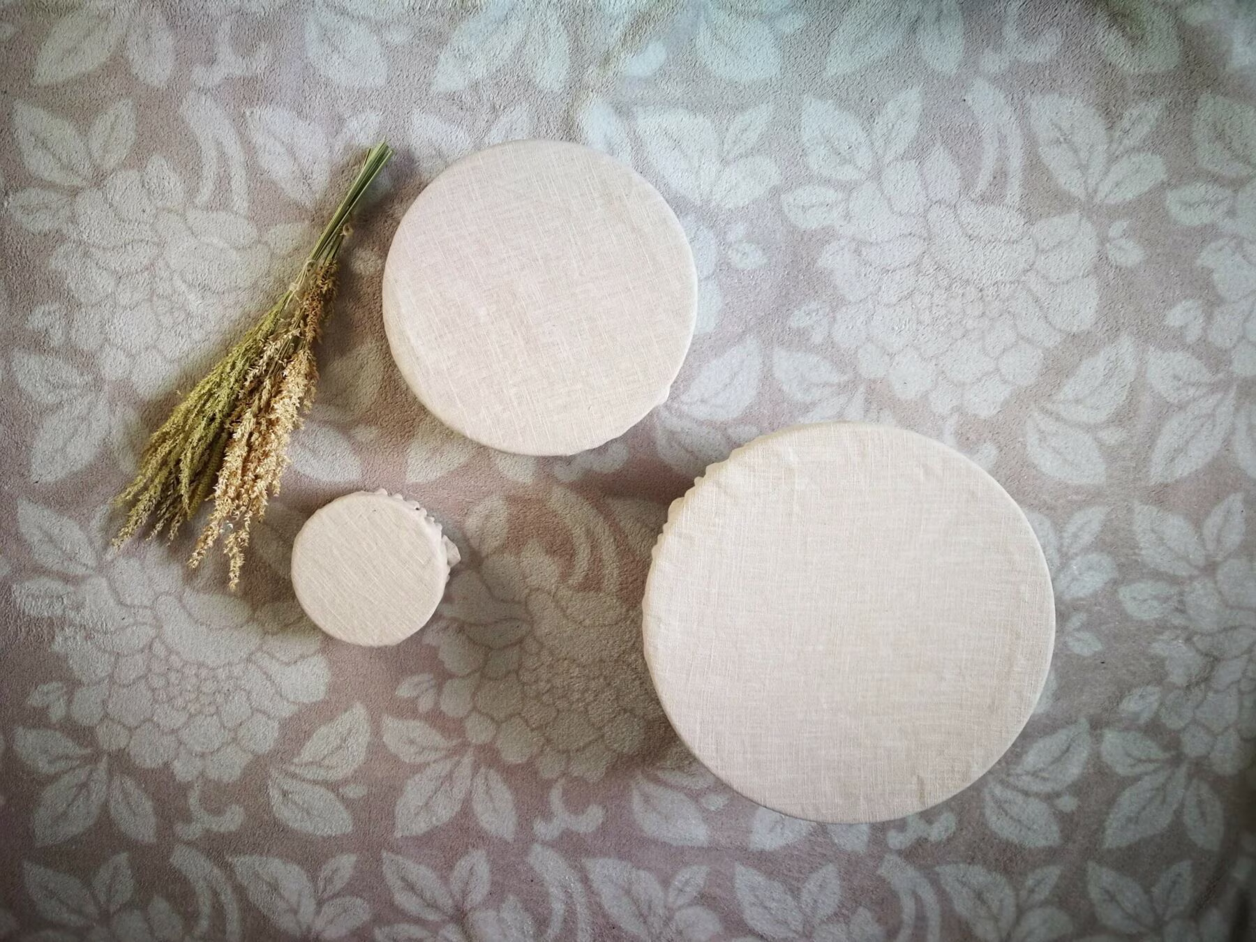 Voici les charlottes couvre-plats alimentaires lavables en joli tissu naturel de lin beige nature, en double épaisseur.