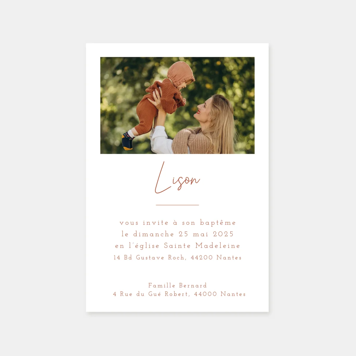 Notre faire-part de baptême un joli moment est un élégant mélange de deux belles photos de votre enfant et d’une mise moderne et épurée composée de deux belles typographies.