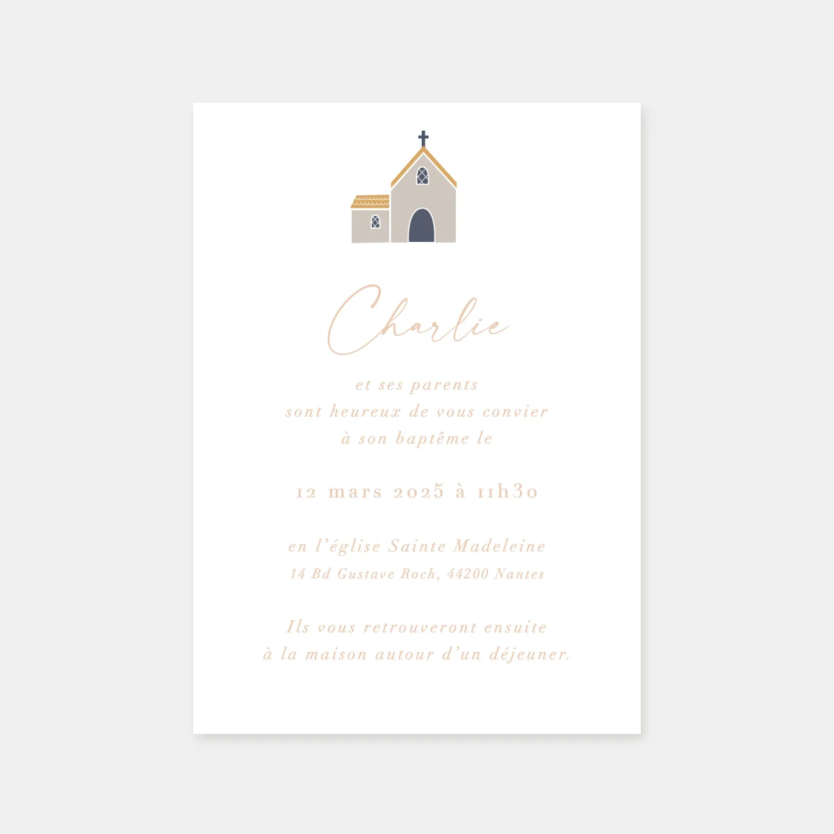 Notre faire-part de baptême un jour de fête est un joli mélange d’une illustration représentant une église dessinée à la main, d’une photo de votre enfant et d’une mise moderne composée de deux belle typographies sur carte simple en format 10×15.
