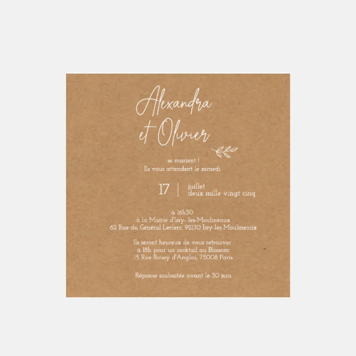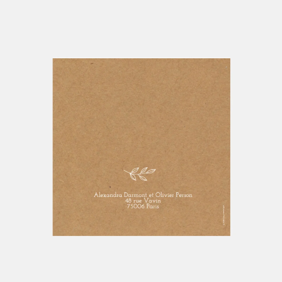 Notre faire-part de mariage Champêtre Kraft est un joli mélange d’une jolie mise en page douce et moderne composée de jolies typographies imprimées en blanc sur un sublime papier kraft composé de 40% de fibres CTMP, 20% de fibres recyclées, 15% de coton et 25% de fibres vierges certifiées FSC®. disponibles en plusieurs coloris.