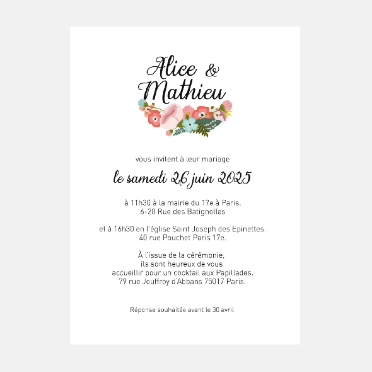 Notre faire-part de mariage Couronne Exotique est un joli mélange d’une couronne fleurie dessinée à la main et d’une d’une mise en page douce et moderne composée de deux belles typographie, l’une manuscrite et l’autre plus conventionnelle.
