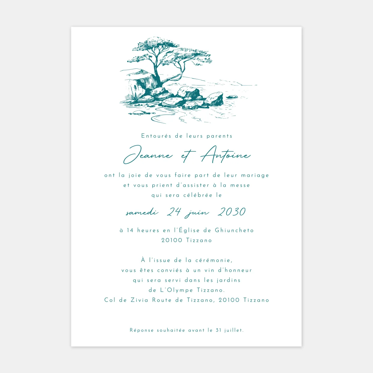 Notre faire-part de mariage gravure montagne est un joli mélange d’un dessin au trait fait à la main représentant un paysage de vallée et d’une mise en page douce et moderne composée avec de deux belles typographies .