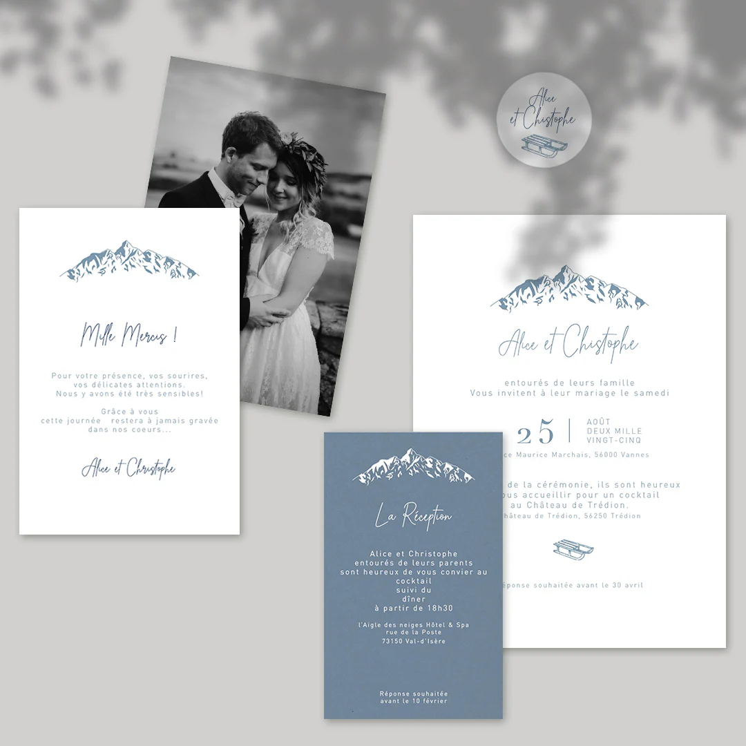 Notre faire-part de mariage montagnes est un joli mélange d’illustrations dans la thématique de la montagne dessinée à la main et d’une mise en page douce et moderne composée plusieurs typographies, manuscrites ou plus conventionnelles.