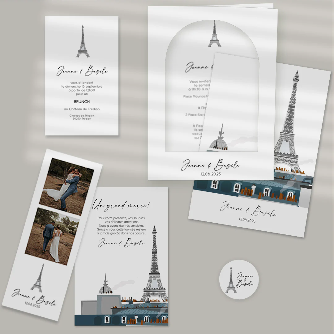 Notre faire-part de mariage programme toit de Paris est un joli mélange d’une illustration réalisée à la main représentant loit de Paris avec vue tour Effiel et d’une mise en moderne composée de plusieurs pictogrammes.