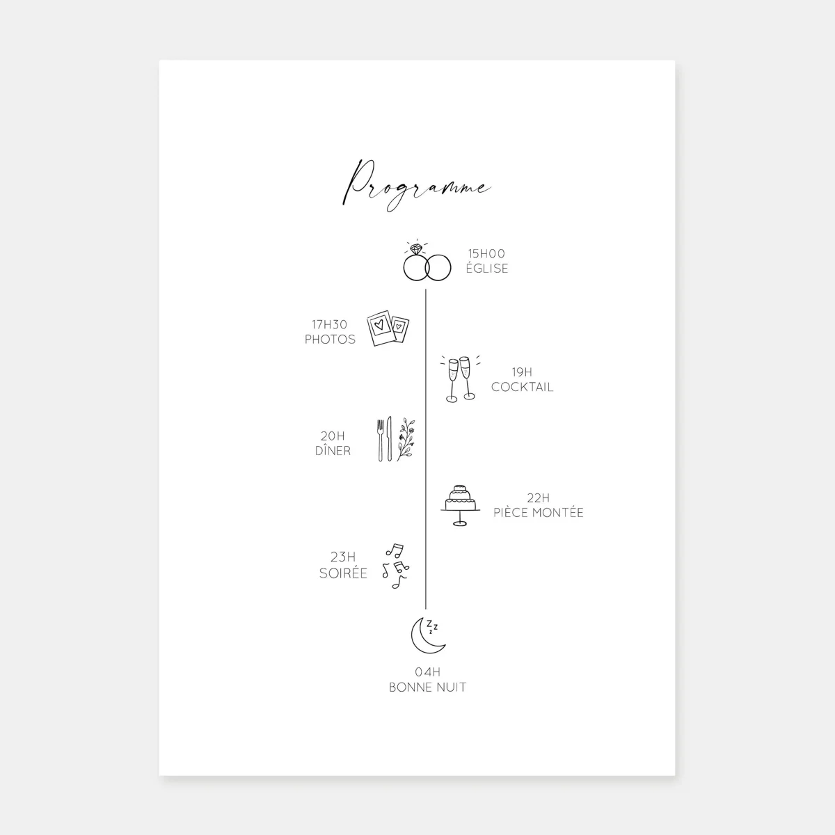 Notre faire-part de mariage une fenêtre sur le jardin est un joli mélange d’une illustration d’une cérémonie de mariage laïque dans un joli jardin champêtre vu depuis une fenêtre en forme d’arche, d’un programme illustrée avec des pictogrammes modifiables et d’une mise en page moderne.