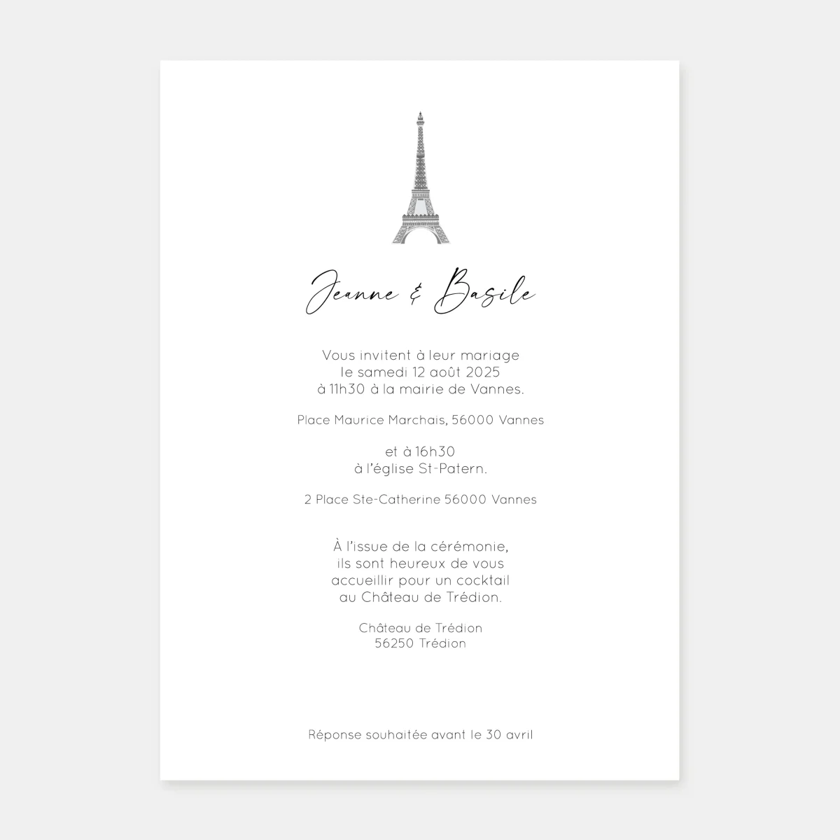 Notre faire-part de mariage une fenêtre sur les toits de Paris est un joli mélange d’une illustration réalisée à la main représentant une vue sur les toits de Paris avec vue tour Eiffel depuis une fenêtre en forme d’arche, d’un programme illustrée avec des pictogrammes modifiables et d’une mise en page moderne composée de deux belles typographies. Tous les faire-part de notre collection Mariage sont imprimés dans notre atelier parisien sur le plus beaux papiers de création certifiés FSC® de notre collection.