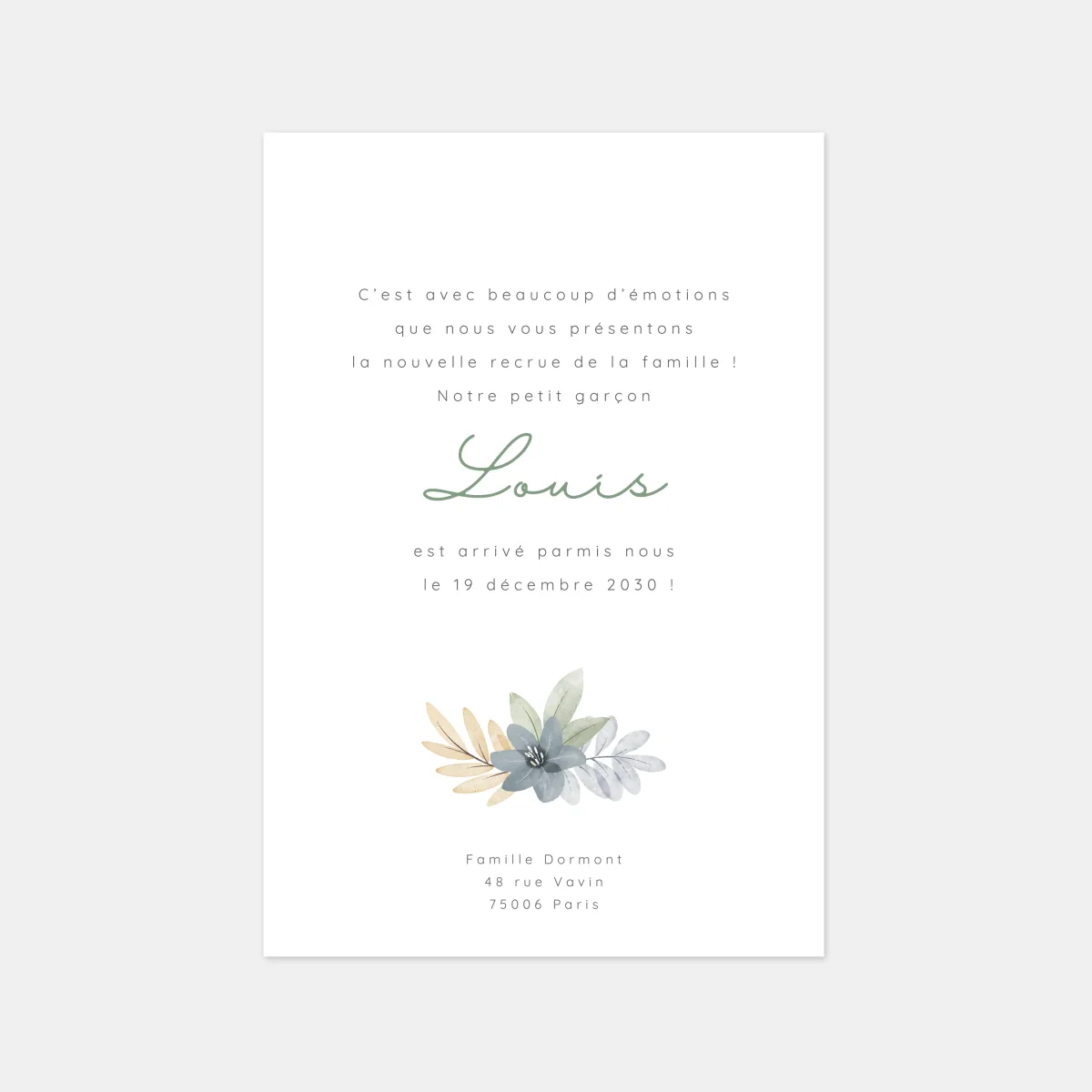 Notre faire-part de naissance couronne végétale eucalyptus est un élégant mélange d’une photo de votre enfant, d’une belle illustration représentant une couronne végétale composée de fleurs et de feuillages dessinée à la main et d’une mise douce et épurée composée de deux belles typographies.