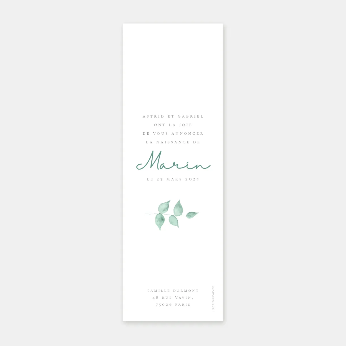 Notre faire-part de naissance marque page aquarelle botanique est un joli mélange d’une petite illustration représentant un couronne de feuille dessinée à la main accompagnée de deux images et d’une mise en page douce et moderne composée de deux belles typographies.