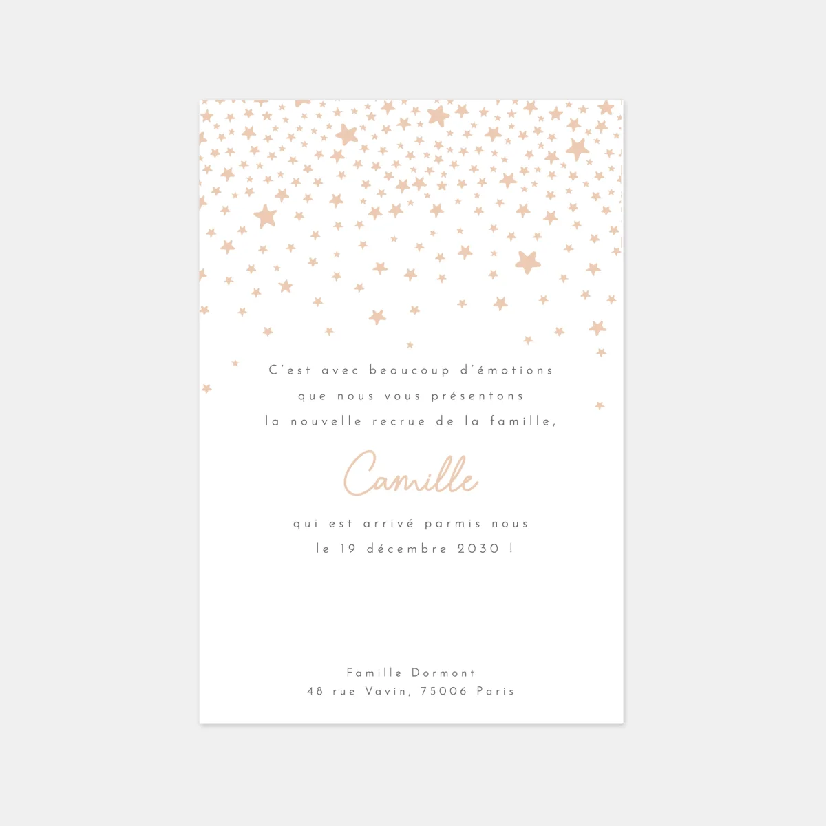 Notre faire-part de naissance né sous une étoile un joli mélange d’une illustration originale d’une pluie d’étoile dont vous pourrez choisir la couleur, d’une photo de votre enfant et d’une mise en page élégante et moderne.