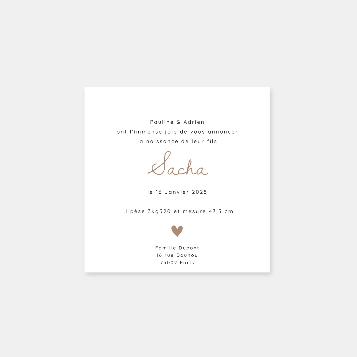 Notre faire-part de naissance polaroid Petit Coeur est la combinaison d’une jolie photo et d’une mise en page douce et moderne composée de plusieurs typographies l’une manuscrite et l’autre plus conventionnelle.