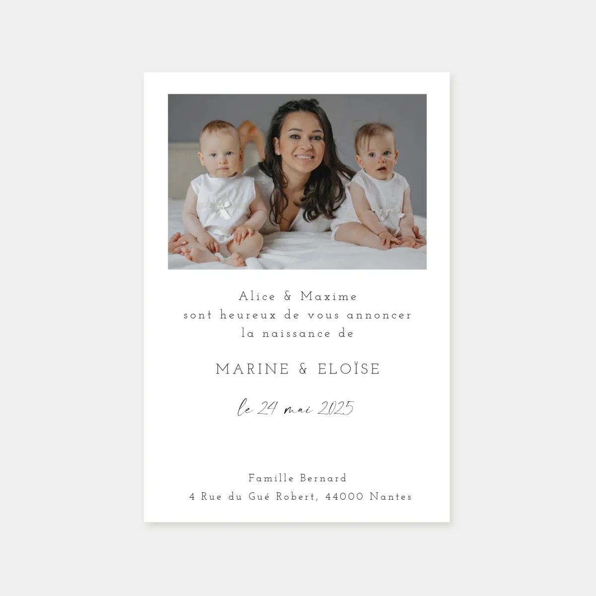 Notre faire-part de naissance un joli moment est un élégant mélange de 4 belles photos de votre famille et d’une mise moderne et épurée composée de deux belles typographies? l’une moderne et l’autre plus contemporaine. Cette carte est réalisée en format carte postale 105×155 mm.