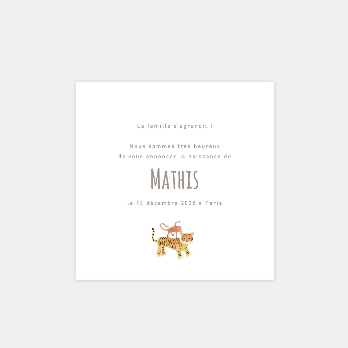Notre faire-part de naissance jungle tigre est un joli mélange d’une belle illustration des animaux de la jungle dessinée à la main et d’une d’une mise en page douce et moderne composée d’une ou plusieurs typographies manuscrite ou plus conventionnelle. Tous les faire-part de notre collection naissance sont imprimés dans notre atelier parisien sur le plus beaux papiers de création certifiés FSC® de notre collection.