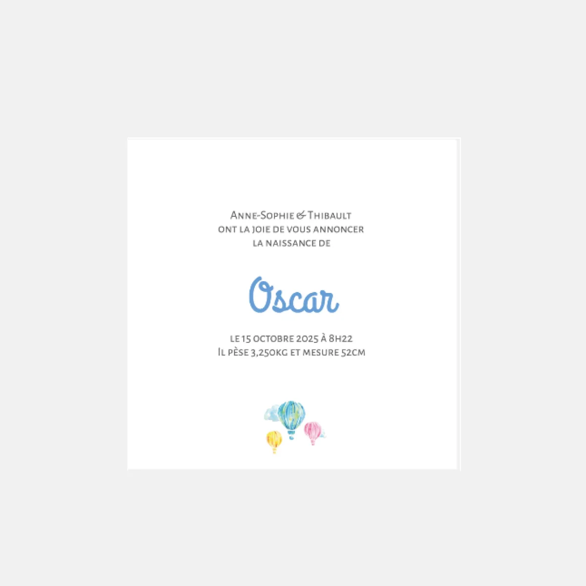 En sélectionnant notre faire-part Montgolfière de notre collection naissance vous optez pour une carte élégante et originale pour annoncer la naissance de votre enfant à vos amis et à votre famille. Tous nos faire-part de naissance sont imprimés dans notre atelier parisien sur le plus beaux papiers de notre collection