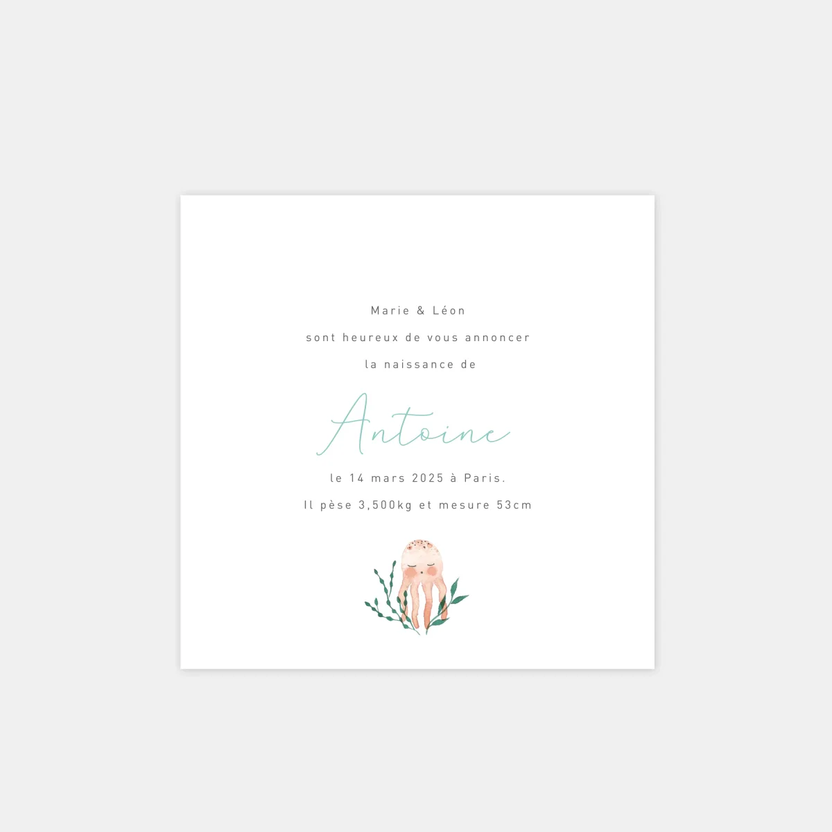 Notre faire-part de naissance pieuvre est un joli mélange d’une belle illustration représentant une pieuvre dessinée à la main et d’une mise en page douce et moderne composée d’une ou plusieurs typographies manuscrite ou plus conventionnelle.