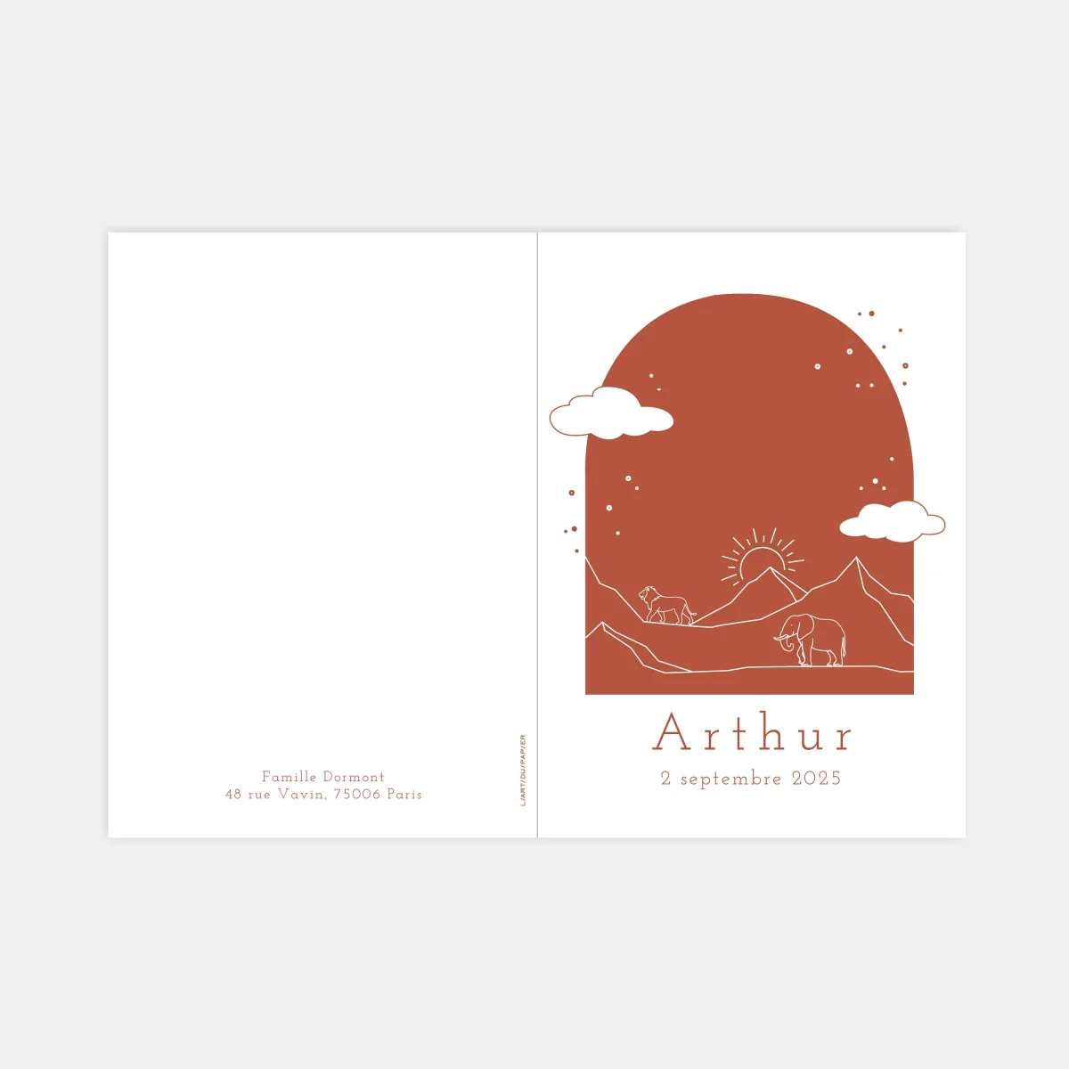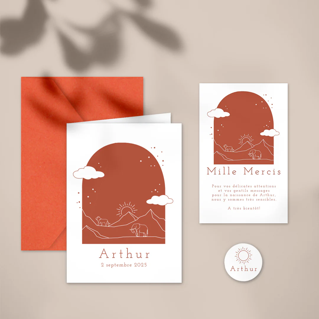 Notre faire-part de naissance une fenêtre sur la savane est un joli mélange d’une illustration représentant une fenêtre avec vu sur la savane dessinée à la main, d’une photo de votre enfant et d’une mise moderne composée d’une jolie typographie et de plusieurs petits pictogrammes modifiables.