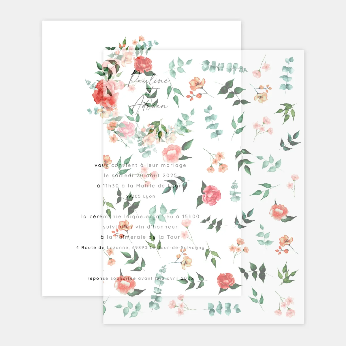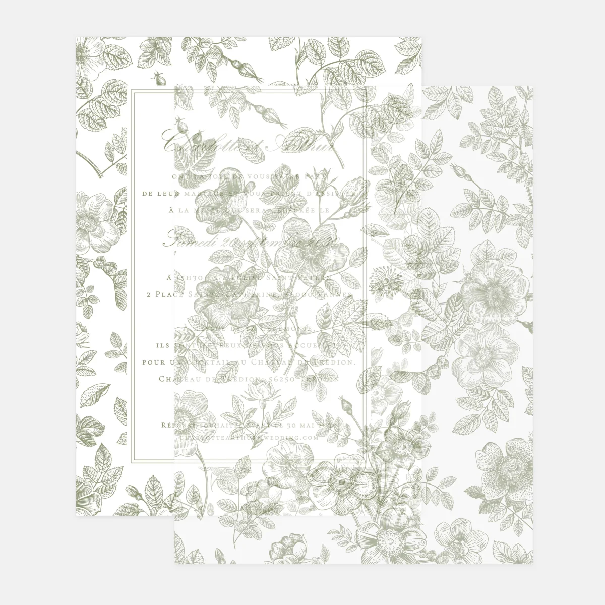 Notre feuillet de calque toile de Jouy florale accompagnera en option votre faire-part de mariage en lui ajoutant une touche de légèreté et de transparence.