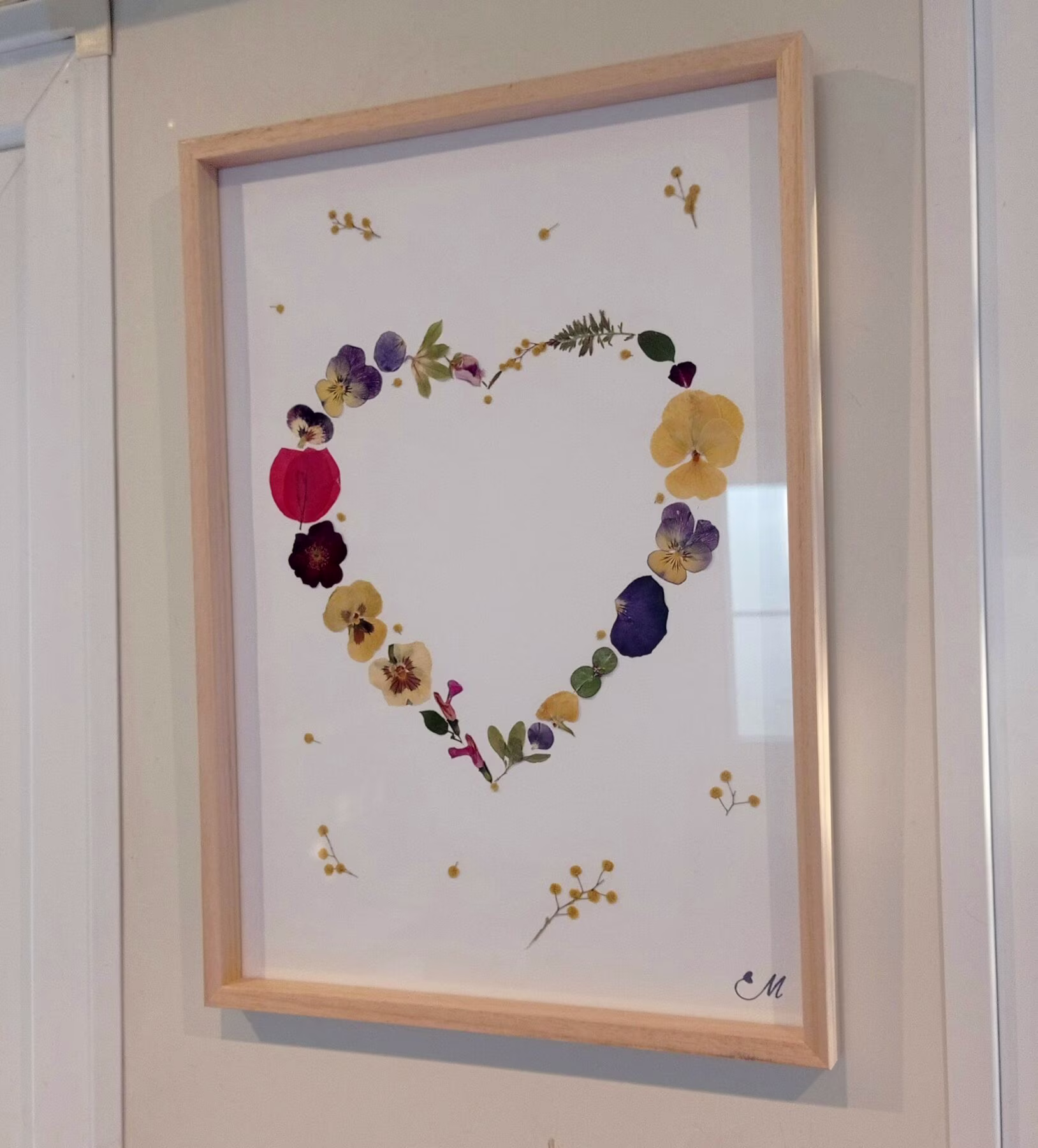 Faites entrer l’amour dans votre maison avec ce tableau fleuri en forme de cÅ“ur Madame Mimosa. Réalisé avec des fleurs du Var, cueillies à la main et séchées pendant plusieurs semaines dans des presses. Ce cadre fleuri apportera poésie et élégance à votre salon, chambre ou pièce de votre choix.