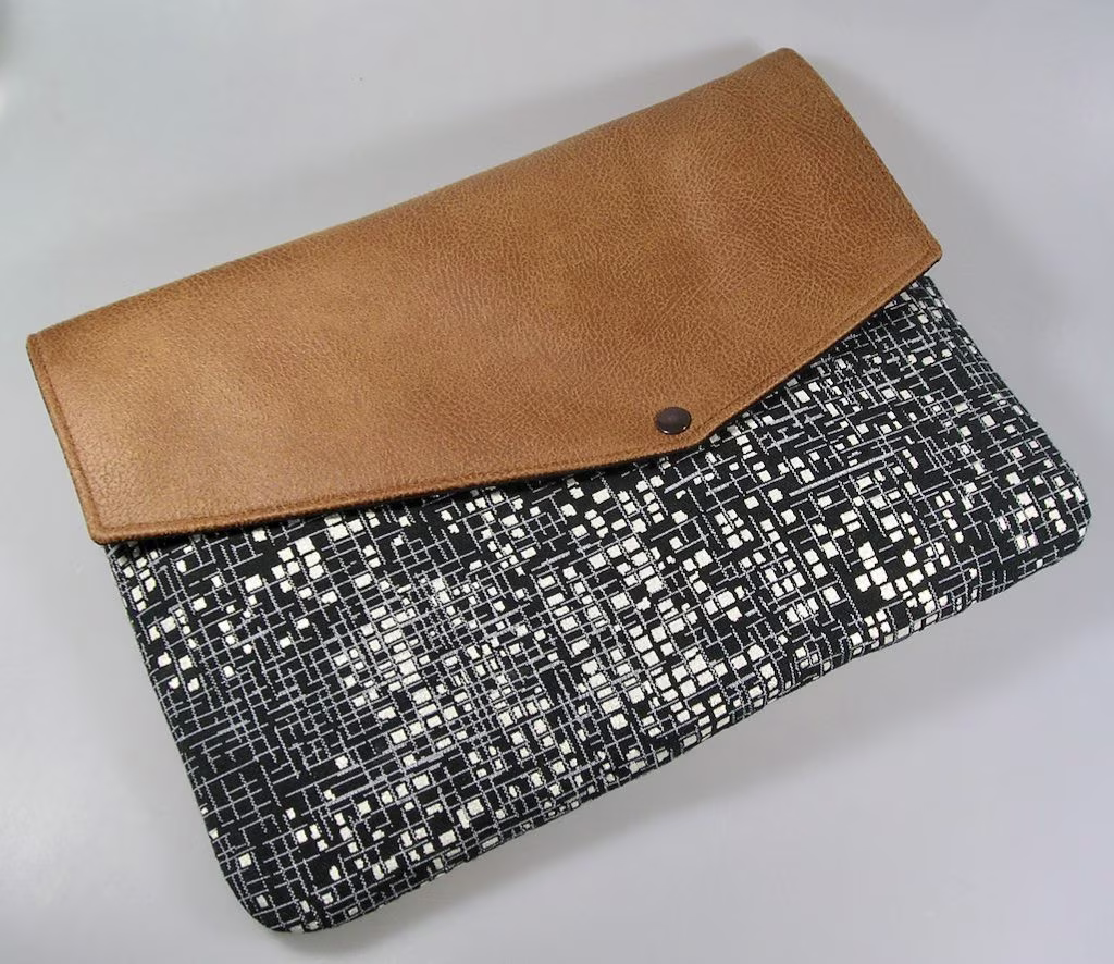 Housse, pochette pour ordinateur portable 13″ à 14″. Cette housse à la fois fonctionnelle et élégante est fabriquée en tissus jacquard noir avec motif géométriques dorés, associé à un simili cuir marron pour le rabat de la pochette. L’intérieur est en coton noir.Â
