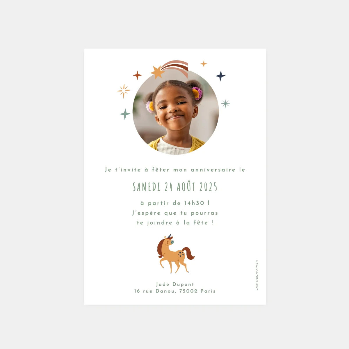 Notre set de d’invitation d’anniversaire licorne est la combinaison d’une belle illustration représentant une licorne, une jolie photo de votre enfant et une mise en page douce et moderne composée de plusieurs typographies.