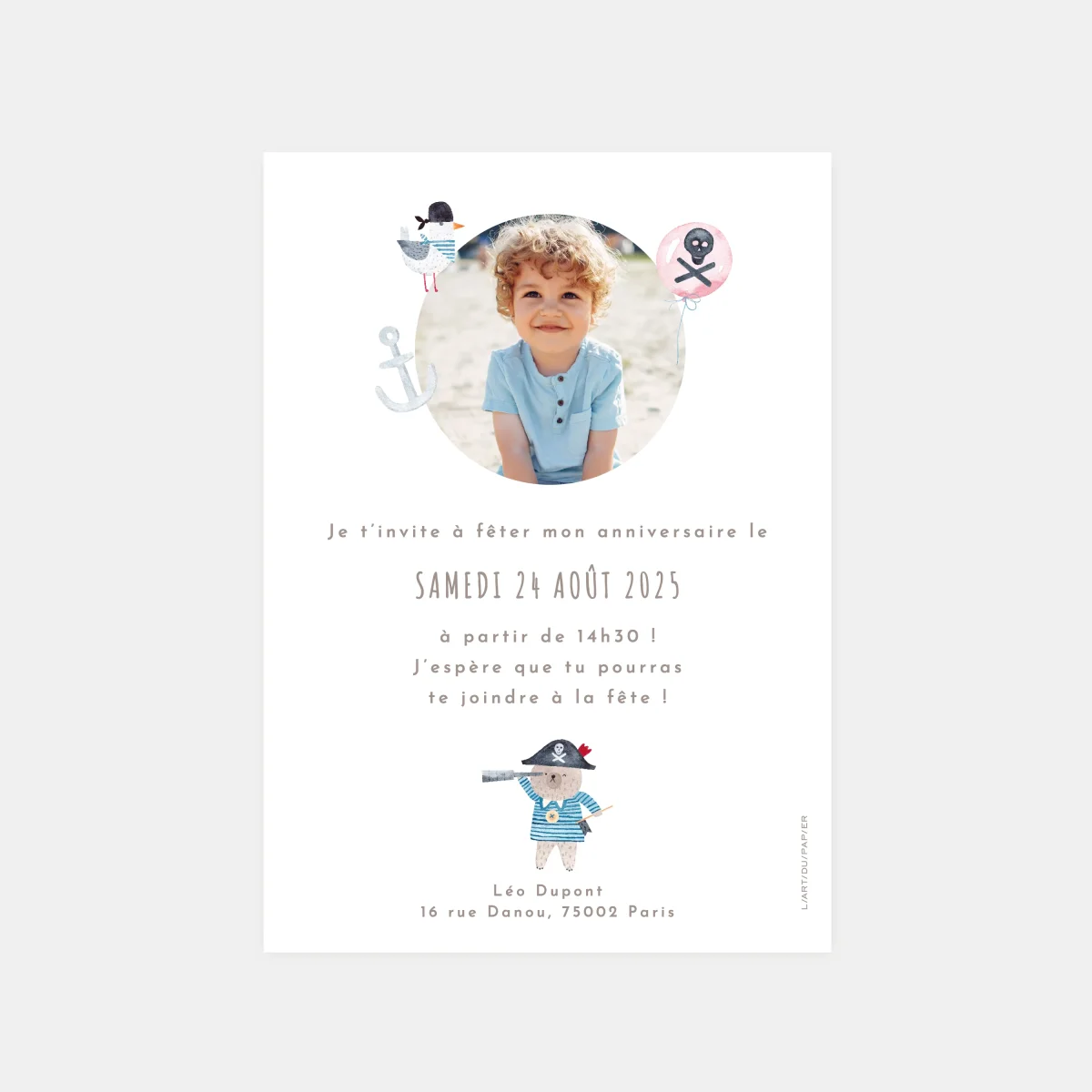 Notre set de d’invitation d’anniversaire pirate est la combinaison d’une belle illustration représentant le thème des pirates, une jolie photo de votre enfant et une mise en page douce et moderne composée de plusieurs typographies.