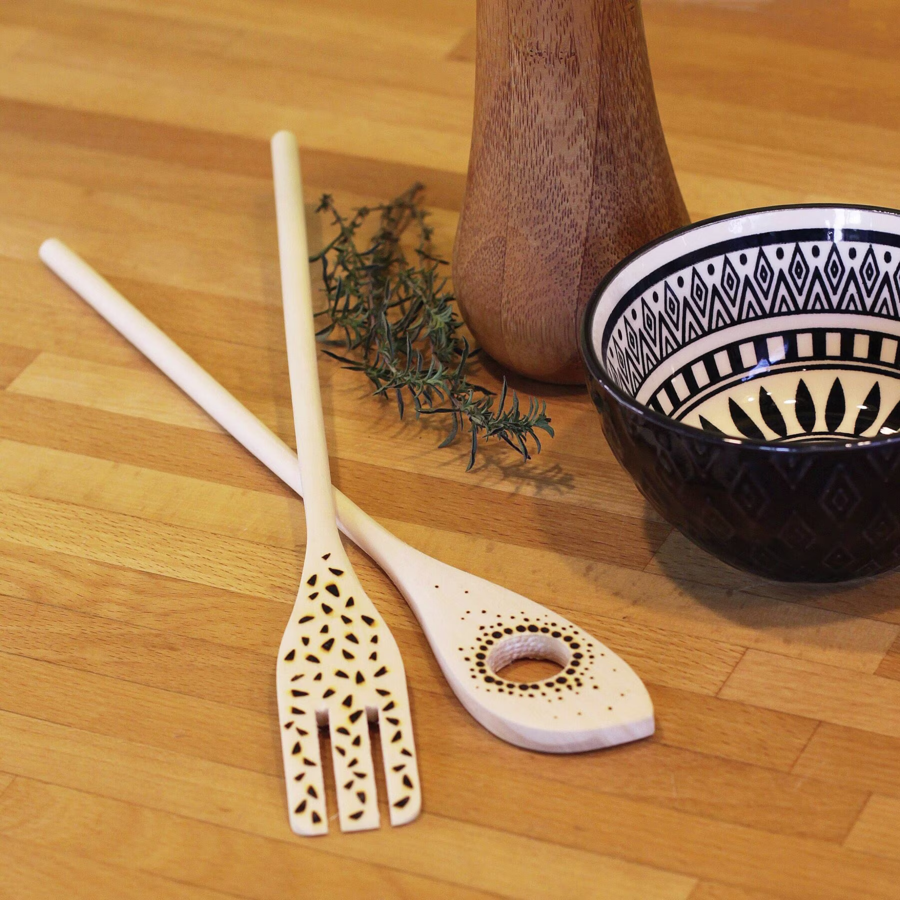 Les 2 spatules en bois naturel ont été gravé à la main à la pyrogravure, pour une belle touche déco dans votre cuisine.