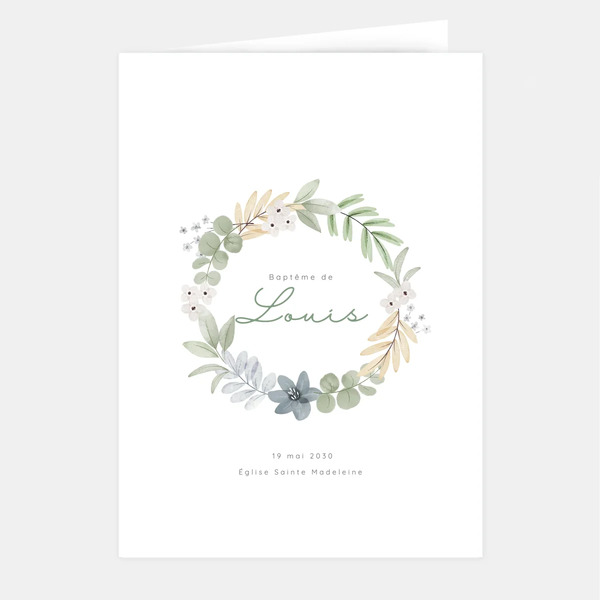 Notre livret de baptême couronne végétale est un élégant mélange d’une belle illustration représentant une couronne végétale composée de fleurs et de feuillages dessinée à la main et d’une mise douce et épurée composée de deux belles typographies.