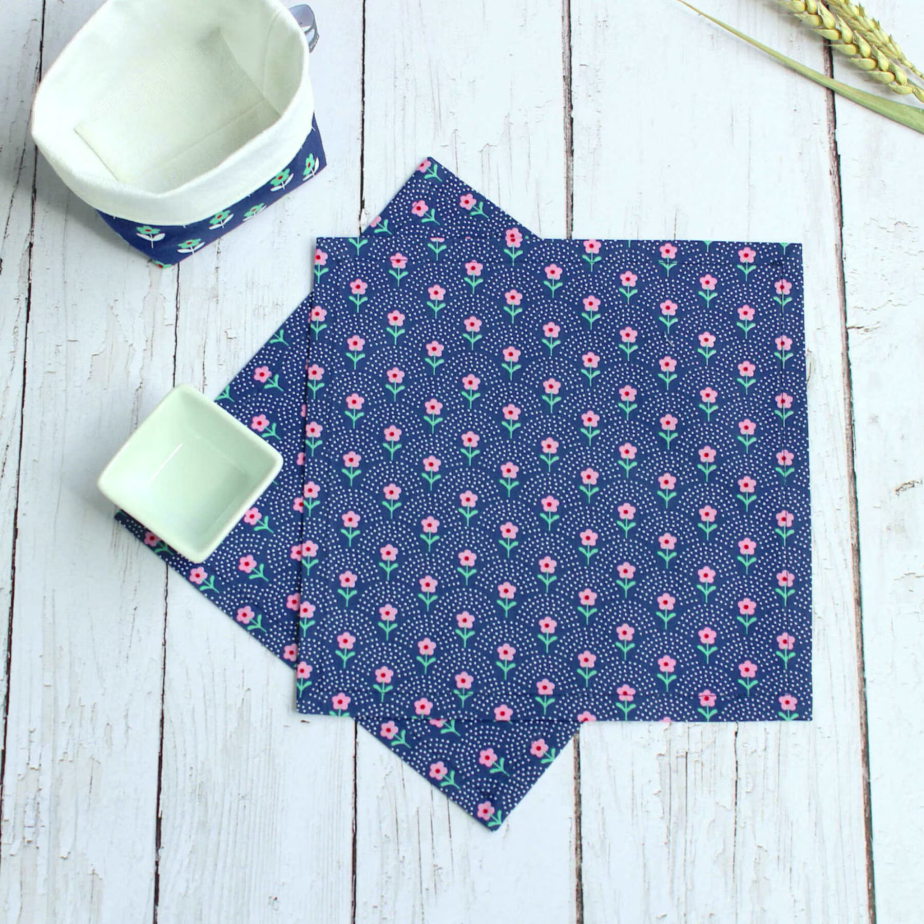 Lot de 6 petites serviettes pour apéritif et panier assorti. 3 couleurs différentes avec le même motif fleuri, pratique pour les réceptions à plusieurs, comme ça chacun sait quelle est sa serviette!