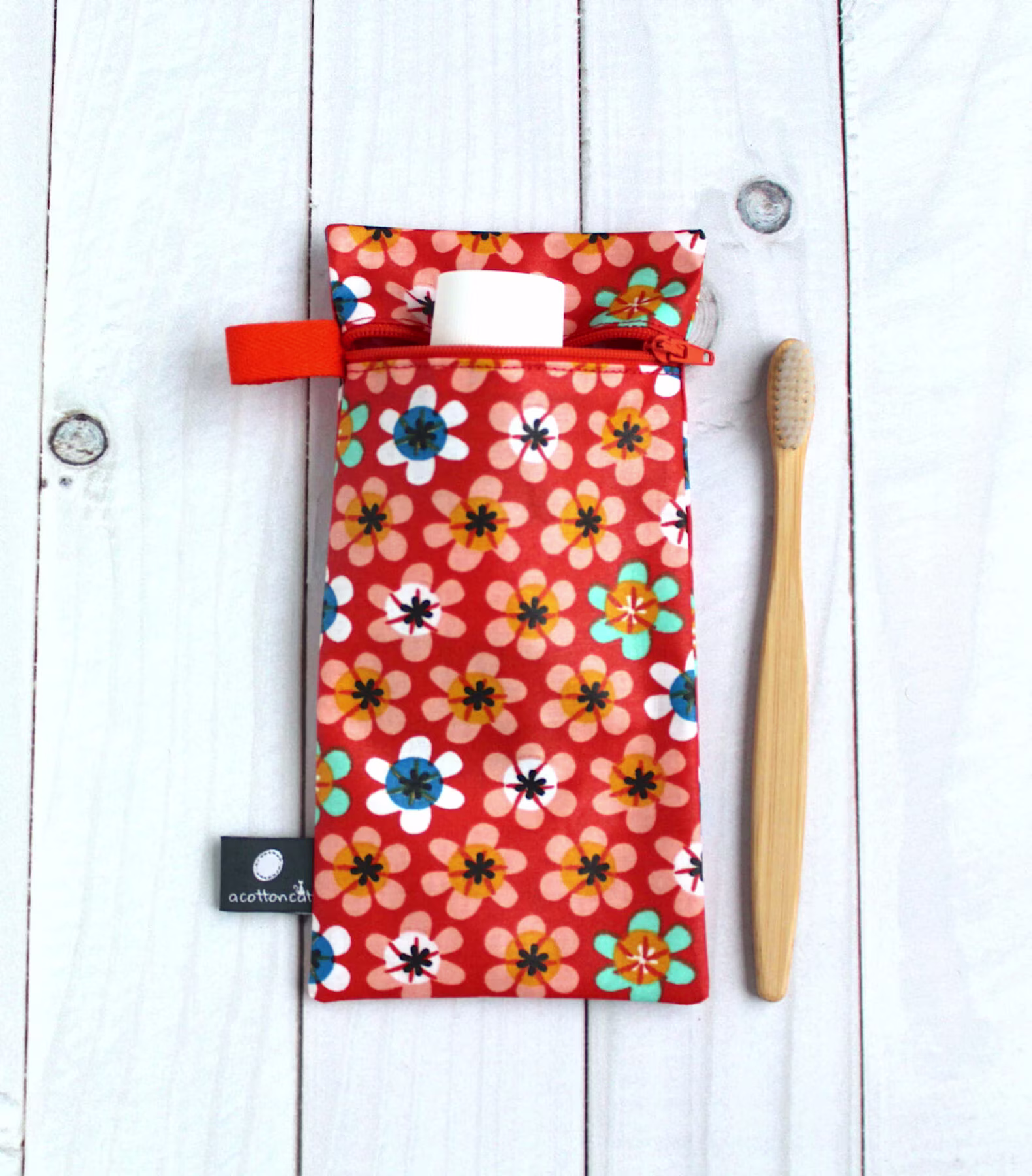 Lot de 2 pochettes enduites, sac à sandwich ou goûter et étui brosse à dents. Tissu fleuri. Finition mate.