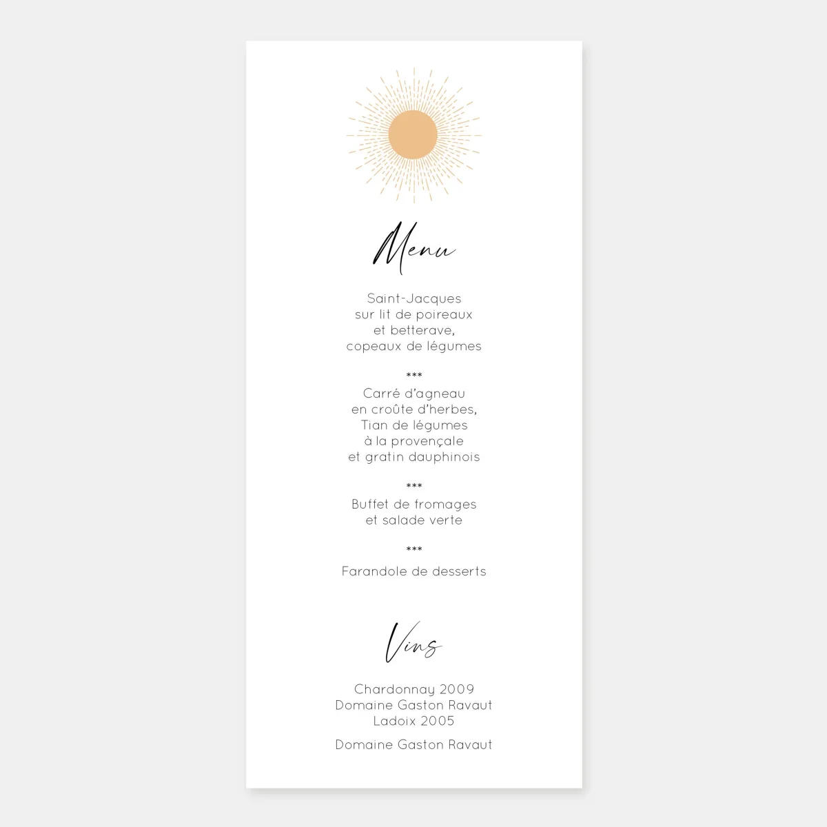 Notre menu de mariage sunset beach est un joli mélange d’une belle illustration d’un couché de soleil sur la plage réalisée à la main et d’une mise en page douce et moderne composée d’une ou plusieurs typographies manuscrite ou plus conventionnelle.
