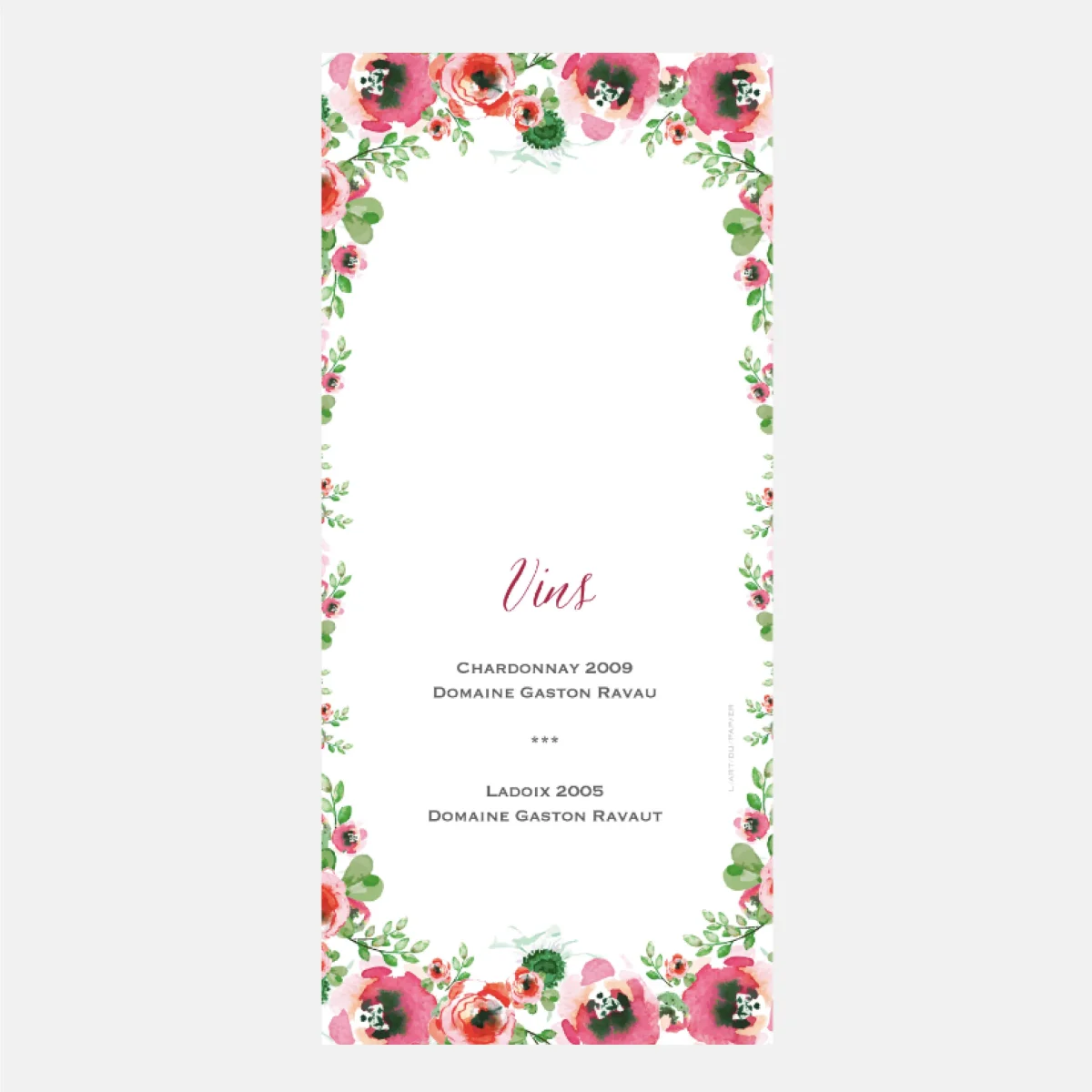 En sélectionnant ce menu Fleurs Aquarelle de notre collection mariage vous optez pour une carte élégante et moderne pour présenter votre menu lors de votre réception de Mariage. Ils décoreront également joliment vos tables. Tous nos menus de Mariage sont imprimés dans notre atelier parisien sur le plus beaux papiers de notre collection.