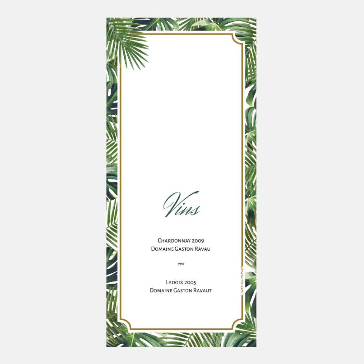 Notre menu de Mariage Jungle Tropical est un joli mélange dÂ’un imprimé végétal tropical, dÂ’un encadré rétro imprimé doré et d’une mise en page douce et actuelle composée de deux belles typographies.