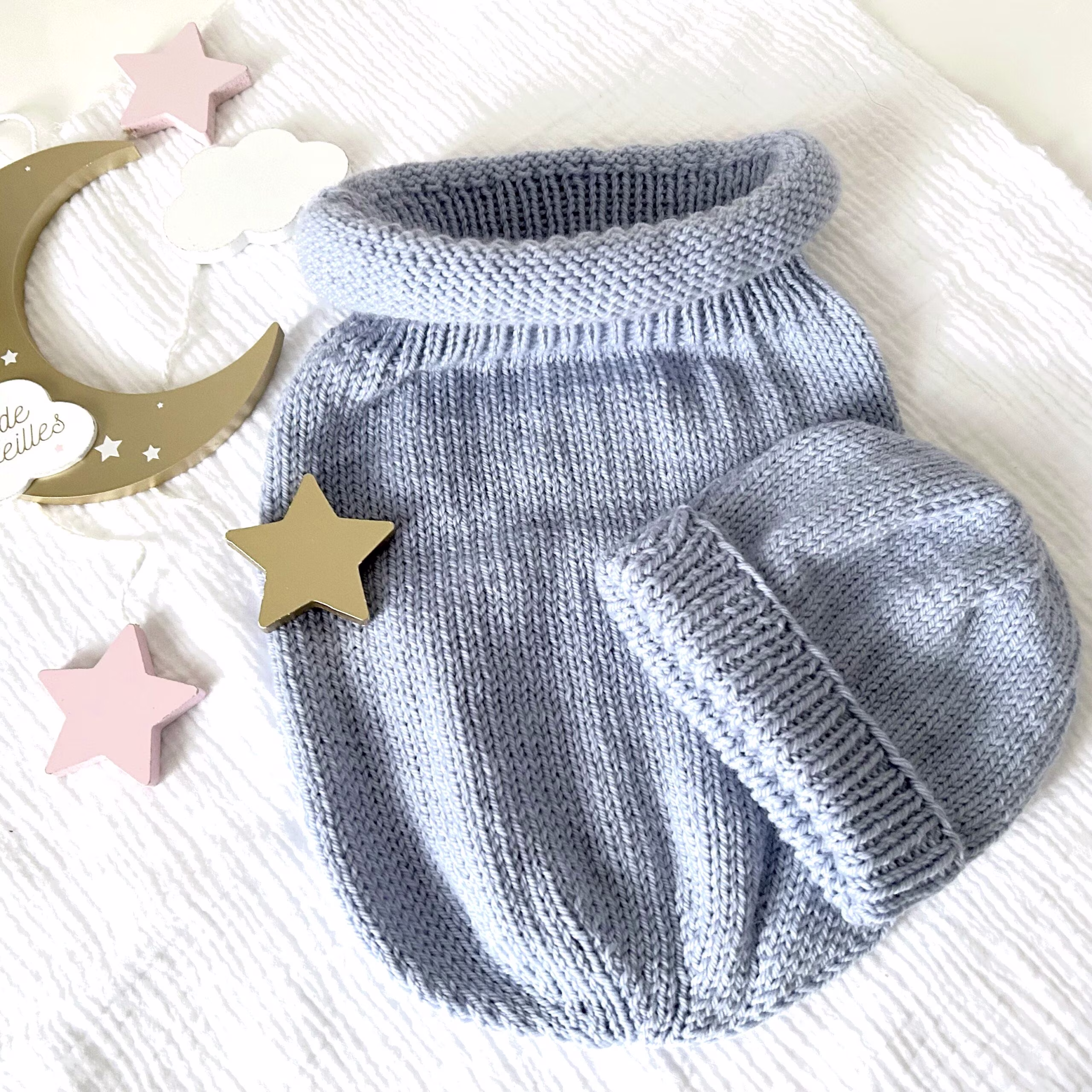 Ce cocon d’emmaillotage bébé et son bonnet est tricoté en laine mérinos semi-epaisse très douce et proposé dans une taille standard naissance, Choisissez votre coloris dans la gamme proposée ci-dessous