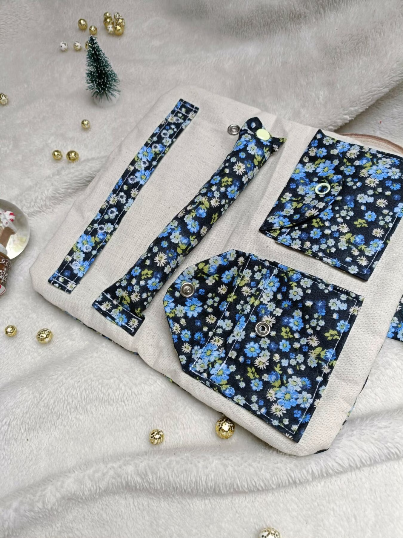 Fermée la pochette mesure environ 20 x 10 cm et se ferme avec un bouton pression.