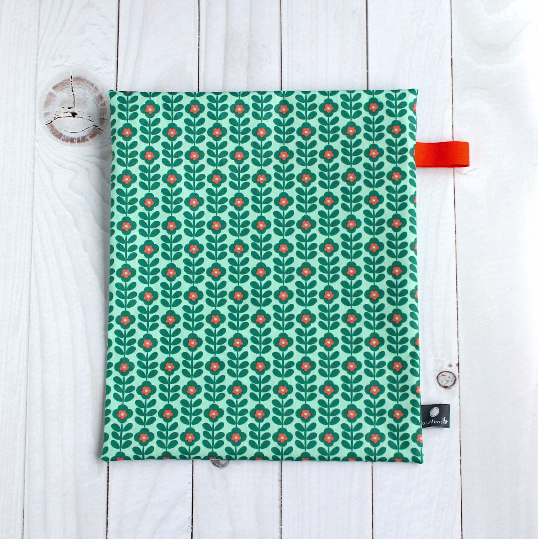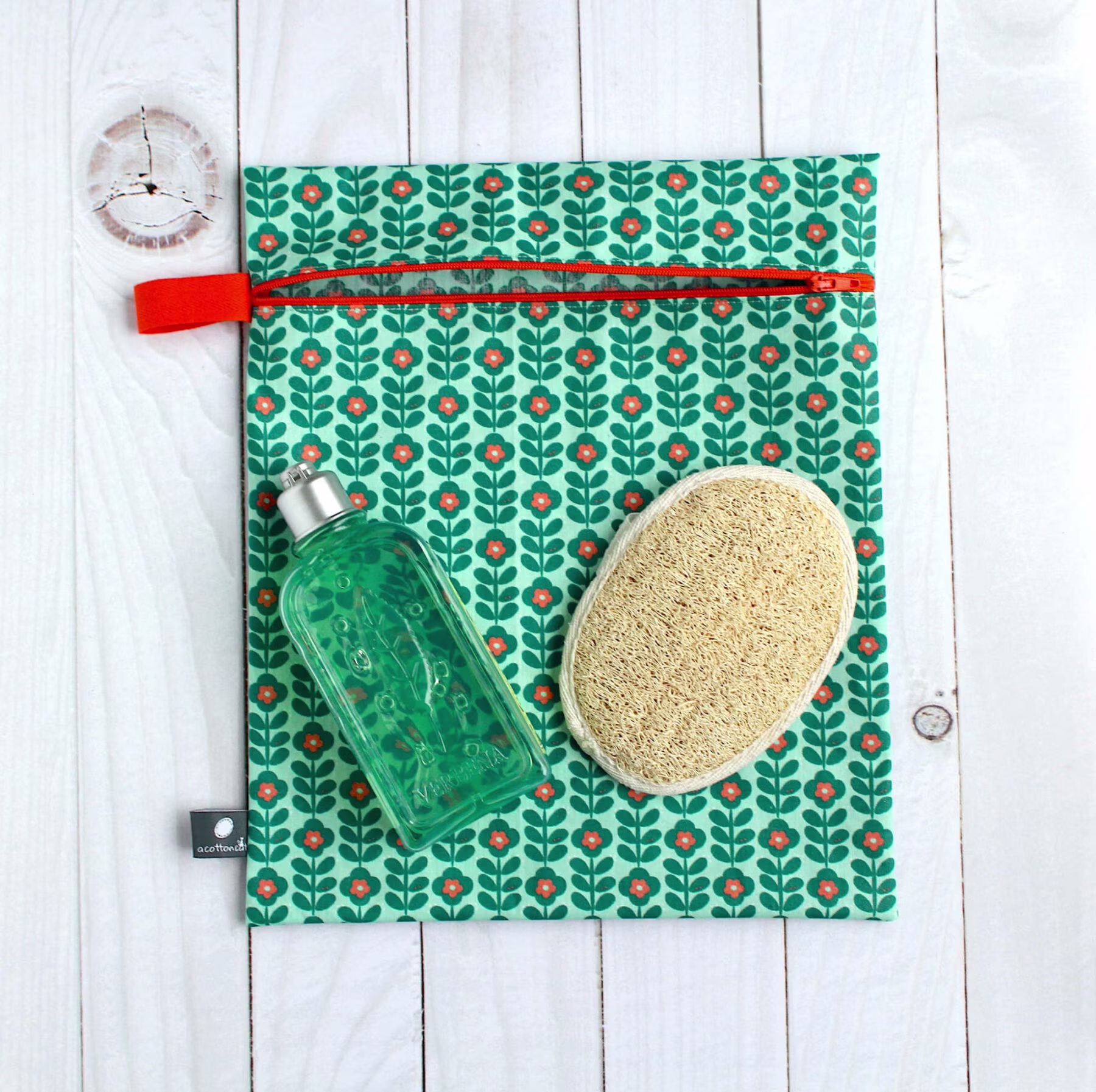 Pochette en coton enduit taille XL, sac à maillot de bain mouillé ou trousse imperméable à motifs fleurs sur fond vert. Pochette zippée avec dragonne .